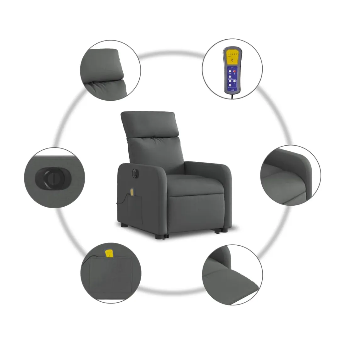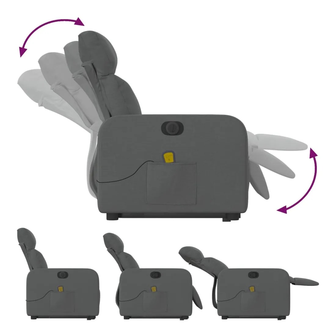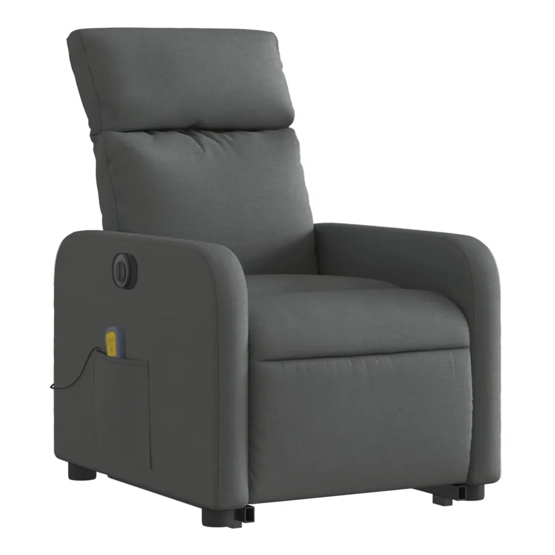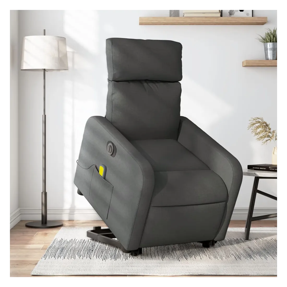 Asseyez-vous et détendez-vous dans ce fauteuil inclinable de massage électrique très confortable ! Fonction de levage électrique : ce fauteuil inclinable pour personnes âgées est équipé d'un moteur électrique pour la fonction de levage. Grâce à la fonction qui pousse toute la chaise vers le haut, vous pouvez facilement vous tenir debout sans stresser votre dos et vos genoux en appuyant simplement sur le bouton.Fonction d'inclinaison électrique : ce fauteuil inclinable est également équipé d'un moteur électrique qui permet de régler automatiquement le repose-pied et le dossier dans n'importe quelle position, selon votre confort, en appuyant simplement sur le bouton situé sur le côté du fauteuil. Cette fonction permet une inclinaison maximale de 135 degrés. En outre, le dossier peut revenir automatiquement à sa position d'origine par une simple pression sur le bouton.Fonction de vibration : les 6 points de massage vous permettent de faire l'expérience d'un massage mieux ciblé. De plus, la télécommande incluse vous permet de choisir différents programmes de massage. La fonction de massage est alimentée par le connecteur USB qui nécessite une source d'alimentation USB certifiée de 5 V (non fournie).Expérience d'assise confortable : le siège, le dossier et les larges accoudoirs bien rembourrés recouverts de tissu procurent une sensation confortable et chaleureuse, vous permettant de vous sentir enveloppé lorsque vous êtes assis. Le tissu présente un aspect simple et épuré et est respirant et durable.Poche latérale pratique : ce fauteuil est doté d'une poche latérale pour vous permettre de garder vos objets essentiels à portée de main.Cadre solide et stable : le cadre en bois et en métal offre une structure solide et une grande stabilité. Ce fauteuil inclinable est confortable et durable.