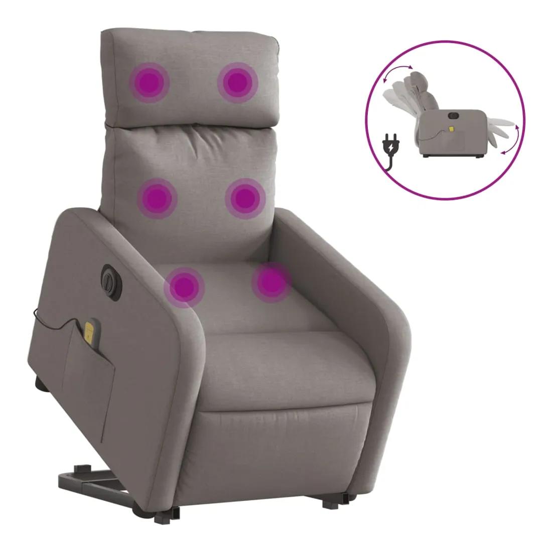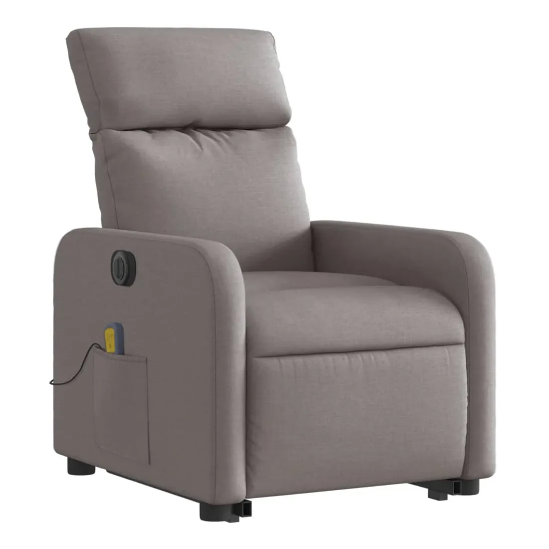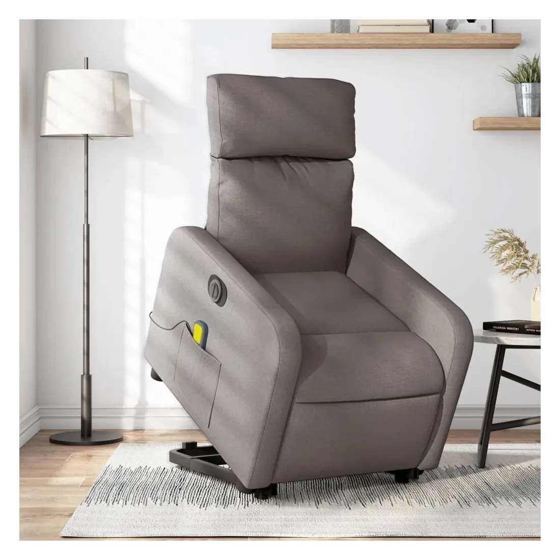 Asseyez-vous et détendez-vous dans ce fauteuil inclinable de massage électrique très confortable ! Fonction de levage électrique : ce fauteuil inclinable pour personnes âgées est équipé d'un moteur électrique pour la fonction de levage. Grâce à la fonction qui pousse toute la chaise vers le haut, vous pouvez facilement vous tenir debout sans stresser votre dos et vos genoux en appuyant simplement sur le bouton.Fonction d'inclinaison électrique : ce fauteuil inclinable est également équipé d'un moteur électrique qui permet de régler automatiquement le repose-pied et le dossier dans n'importe quelle position, selon votre confort, en appuyant simplement sur le bouton situé sur le côté du fauteuil. Cette fonction permet une inclinaison maximale de 135 degrés. En outre, le dossier peut revenir automatiquement à sa position d'origine par une simple pression sur le bouton.Fonction de vibration : les 6 points de massage vous permettent de faire l'expérience d'un massage mieux ciblé. De plus, la télécommande incluse vous permet de choisir différents programmes de massage. La fonction de massage est alimentée par le connecteur USB qui nécessite une source d'alimentation USB certifiée de 5 V (non fournie).Expérience d'assise confortable : le siège, le dossier et les larges accoudoirs bien rembourrés recouverts de tissu procurent une sensation confortable et chaleureuse, vous permettant de vous sentir enveloppé lorsque vous êtes assis. Le tissu présente un aspect simple et épuré et est respirant et durable.Poche latérale pratique : ce fauteuil est doté d'une poche latérale pour vous permettre de garder vos objets essentiels à portée de main.Cadre solide et stable : le cadre en bois et en métal offre une structure solide et une grande stabilité. Ce fauteuil inclinable est confortable et durable.