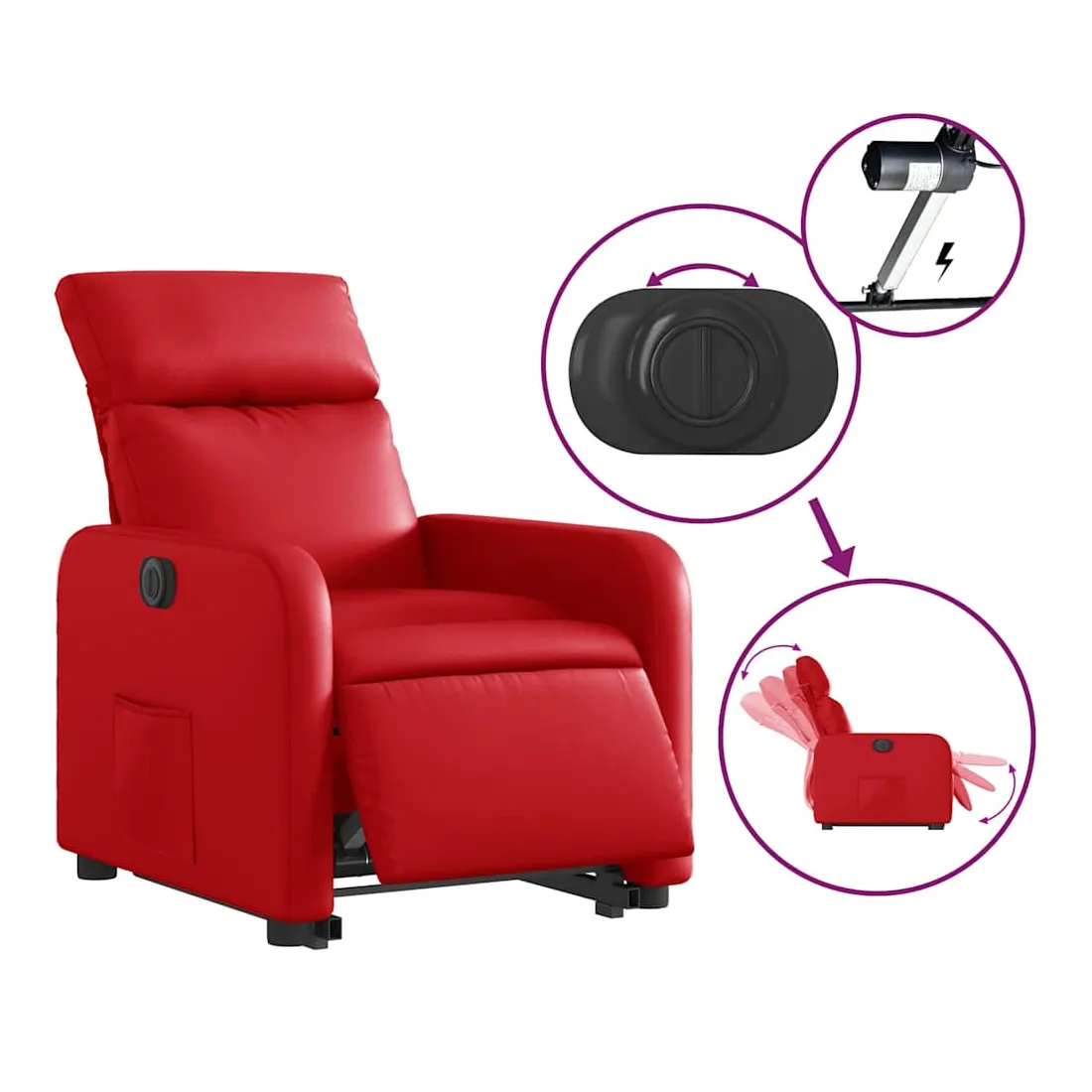 Asseyez-vous et détendez-vous dans ce fauteuil inclinable électrique très confortable ! Fonction de levage électrique : ce fauteuil inclinable pour personnes âgées est équipé d'un moteur électrique pour la fonction de levage. Grâce à la fonction qui pousse toute la chaise vers le haut, vous pouvez facilement vous tenir debout sans stresser votre dos et vos genoux en appuyant simplement sur le bouton.Fonction d'inclinaison électrique : ce fauteuil inclinable est également équipé d'un moteur électrique qui permet de régler automatiquement le repose-pied et le dossier dans n'importe quelle position, selon votre confort, en appuyant simplement sur le bouton situé sur le côté du fauteuil. Cette fonction permet une inclinaison maximale de 135 degrés. En outre, le dossier peut revenir automatiquement à sa position d'origine par une simple pression sur le bouton.Expérience de siège confortable : le siège, le dossier et les larges accoudoirs rembourrés épais recouverts de similicuir procurent une sensation confortable, vous faisant vous sentir enlacé lorsque vous êtes assis. Le similicuir est un matériau très résistant. Il est résistant aux taches, ce qui le rend facile à nettoyer avec un chiffon humide. La surface lisse donne également un aspect luxueux et la beauté du cuir véritable.Poche latérale pratique : ce fauteuil est doté d'une poche latérale pour vous permettre de garder vos objets essentiels à portée de main.Cadre solide et stable : le cadre en bois et en métal offre une structure solide et une grande stabilité. Ce fauteuil inclinable est confortable et durable.