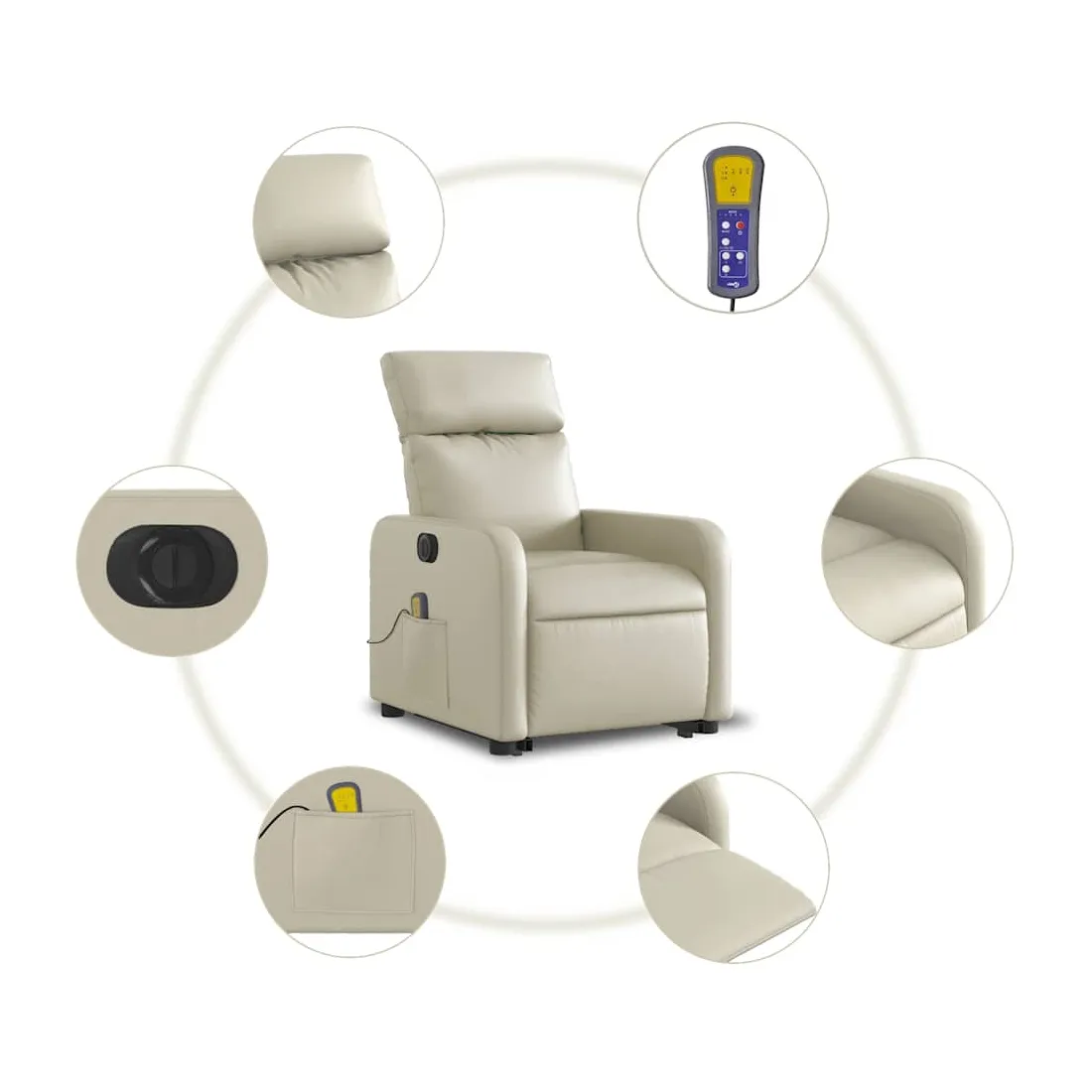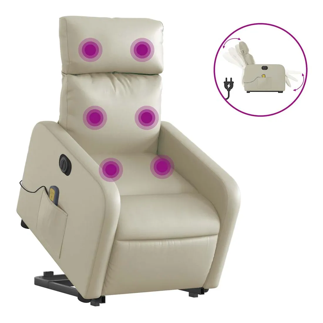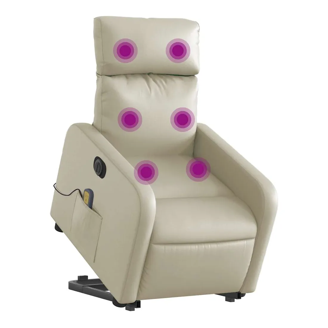 Asseyez-vous et détendez-vous dans ce fauteuil inclinable de massage électrique très confortable ! Fonction de levage électrique : ce fauteuil inclinable pour personnes âgées est équipé d'un moteur électrique pour la fonction de levage. Grâce à la fonction qui pousse toute la chaise vers le haut, vous pouvez facilement vous tenir debout sans stresser votre dos et vos genoux en appuyant simplement sur le bouton.Fonction d'inclinaison électrique : ce fauteuil inclinable est également équipé d'un moteur électrique qui permet de régler automatiquement le repose-pied et le dossier dans n'importe quelle position, selon votre confort, en appuyant simplement sur le bouton situé sur le côté du fauteuil. Cette fonction permet une inclinaison maximale de 135 degrés. En outre, le dossier peut revenir automatiquement à sa position d'origine par une simple pression sur le bouton.Fonction de vibration : les 6 points de massage vous permettent de faire l'expérience d'un massage mieux ciblé. De plus, la télécommande incluse vous permet de choisir différents programmes de massage. La fonction de massage est alimentée par le connecteur USB qui nécessite une source d'alimentation USB certifiée de 5 V (non fournie).Expérience de siège confortable : le siège, le dossier et les larges accoudoirs rembourrés épais recouverts de similicuir procurent une sensation confortable, vous faisant vous sentir enlacé lorsque vous êtes assis. Le similicuir est un matériau très résistant. Il est résistant aux taches, ce qui le rend facile à nettoyer avec un chiffon humide. La surface lisse donne également un aspect luxueux et la beauté du cuir véritable.Poche latérale pratique : ce fauteuil est doté d'une poche latérale pour vous permettre de garder vos objets essentiels à portée de main.Cadre solide et stable : le cadre en bois et en métal offre une structure solide et une grande stabilité. Ce fauteuil inclinable est confortable et durable.