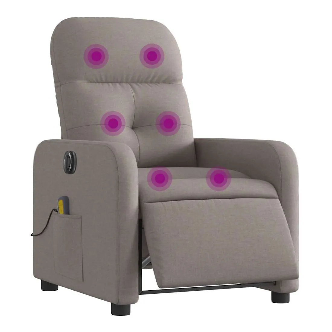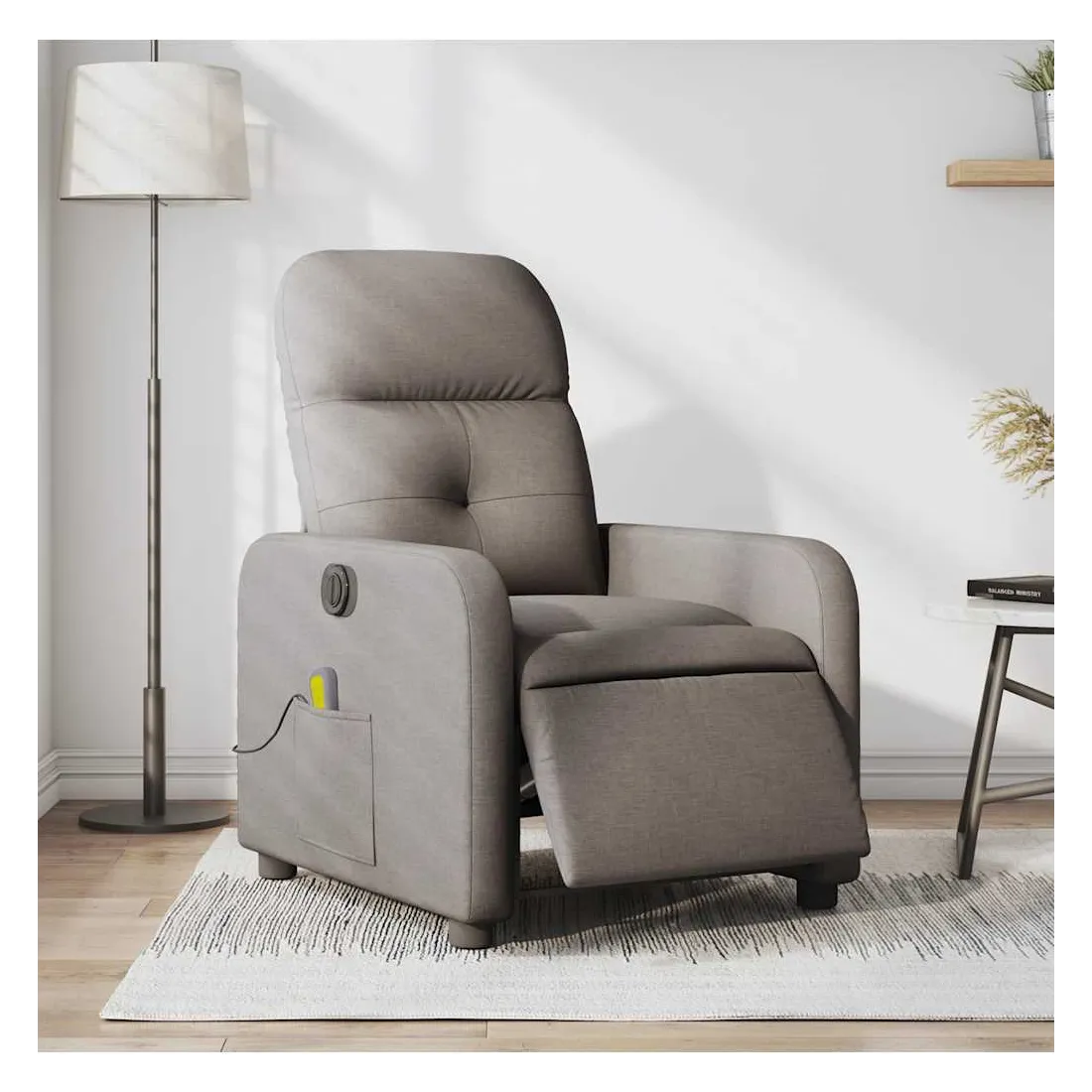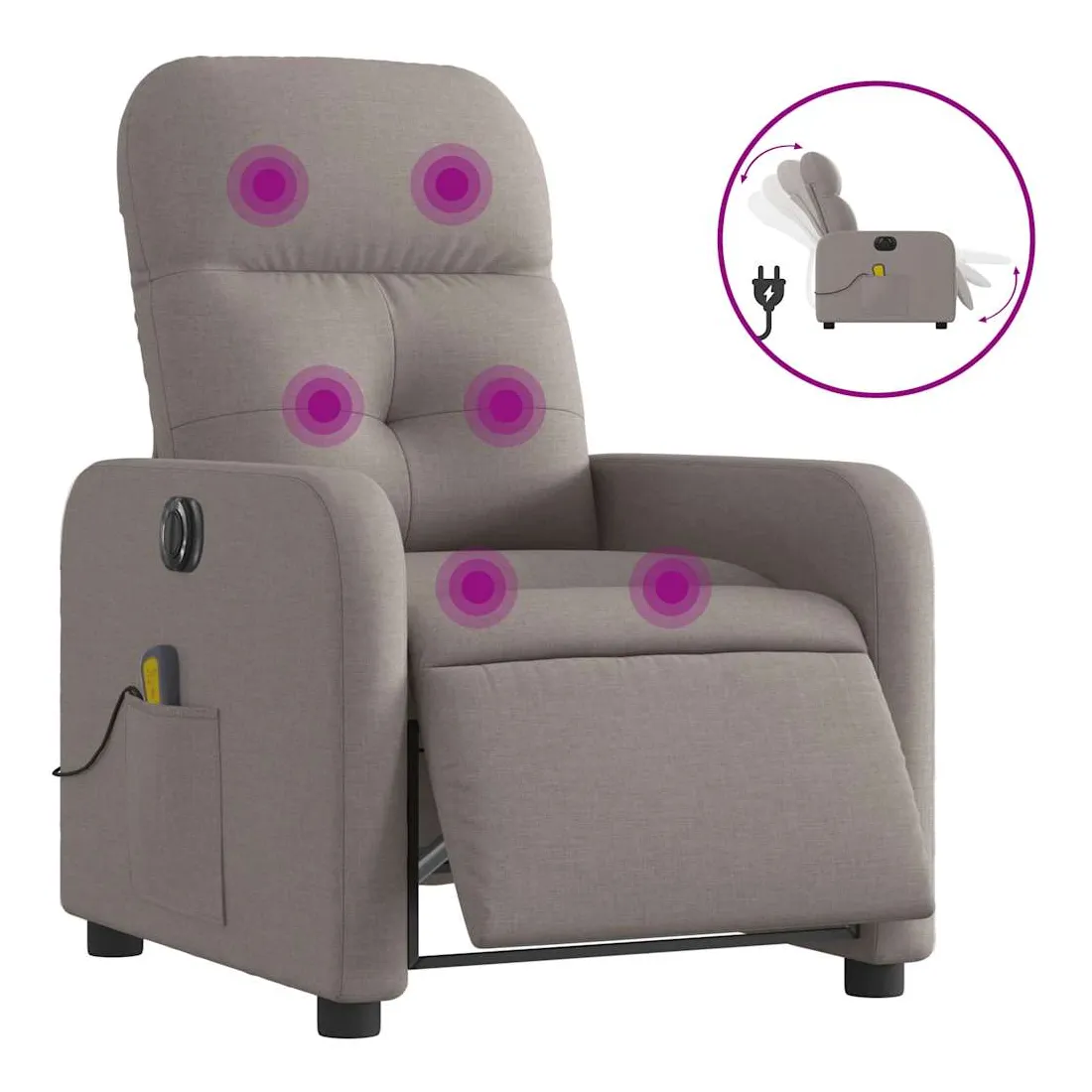 Asseyez-vous et détendez-vous dans ce fauteuil inclinable de massage électrique très confortable ! Fonction d'inclinaison électrique : ce fauteuil inclinable est équipé d'un moteur électrique qui permet de régler automatiquement le repose-pied et le dossier dans n'importe quelle position, selon votre confort, en appuyant simplement sur le bouton situé sur le côté du fauteuil. Cette fonction permet une inclinaison maximale de 135 degrés. En outre, le dossier peut revenir automatiquement à sa position d'origine par une simple pression sur le bouton.Fonction de vibration : les 6 points de massage vous permettent de faire l'expérience d'un massage mieux ciblé. De plus, la télécommande incluse vous permet de choisir différents programmes de massage. La fonction de massage est alimentée par le connecteur USB qui nécessite une source d'alimentation USB certifiée de 5 V (non fournie).Expérience d'assise confortable : le siège, le dossier et les larges accoudoirs bien rembourrés recouverts de tissu procurent une sensation confortable et chaleureuse, vous permettant de vous sentir enveloppé lorsque vous êtes assis. Le tissu présente un aspect simple et épuré et est respirant et durable.Poche latérale pratique : ce fauteuil est doté d'une poche latérale pour ranger votre télécommande ou garder vos objets essentiels à portée de main.Cadre solide et stable : le cadre en bois et en métal offre une structure solide et une grande stabilité. Ce fauteuil inclinable est confortable et durable.