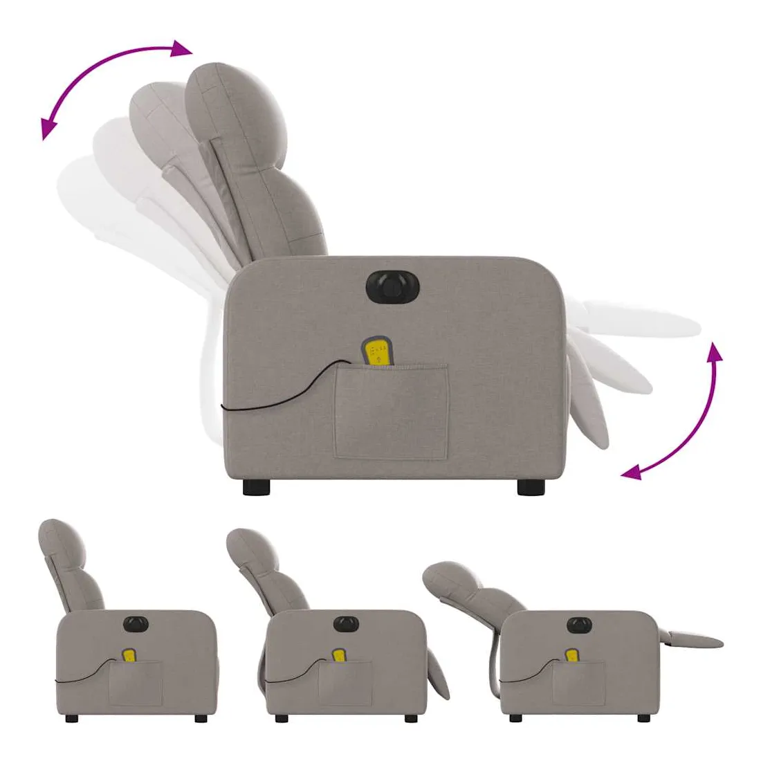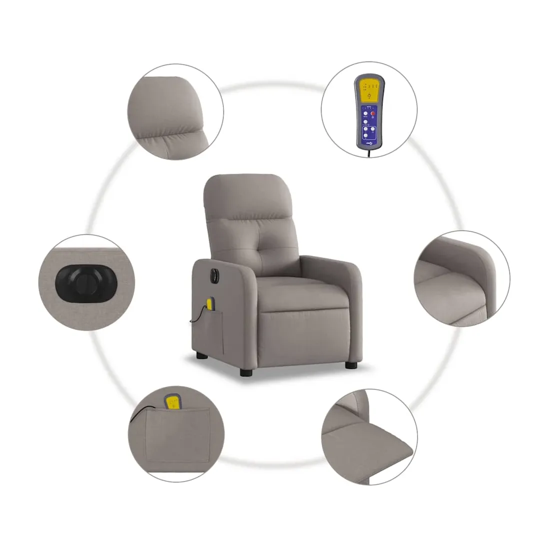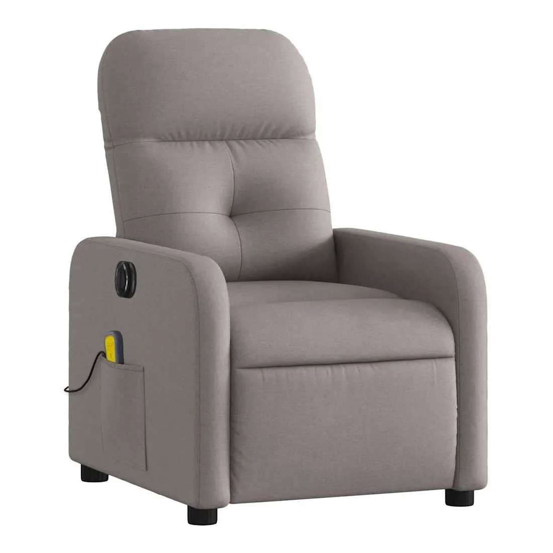 Asseyez-vous et détendez-vous dans ce fauteuil inclinable de massage électrique très confortable ! Fonction d'inclinaison électrique : ce fauteuil inclinable est équipé d'un moteur électrique qui permet de régler automatiquement le repose-pied et le dossier dans n'importe quelle position, selon votre confort, en appuyant simplement sur le bouton situé sur le côté du fauteuil. Cette fonction permet une inclinaison maximale de 135 degrés. En outre, le dossier peut revenir automatiquement à sa position d'origine par une simple pression sur le bouton.Fonction de vibration : les 6 points de massage vous permettent de faire l'expérience d'un massage mieux ciblé. De plus, la télécommande incluse vous permet de choisir différents programmes de massage. La fonction de massage est alimentée par le connecteur USB qui nécessite une source d'alimentation USB certifiée de 5 V (non fournie).Expérience d'assise confortable : le siège, le dossier et les larges accoudoirs bien rembourrés recouverts de tissu procurent une sensation confortable et chaleureuse, vous permettant de vous sentir enveloppé lorsque vous êtes assis. Le tissu présente un aspect simple et épuré et est respirant et durable.Poche latérale pratique : ce fauteuil est doté d'une poche latérale pour ranger votre télécommande ou garder vos objets essentiels à portée de main.Cadre solide et stable : le cadre en bois et en métal offre une structure solide et une grande stabilité. Ce fauteuil inclinable est confortable et durable.