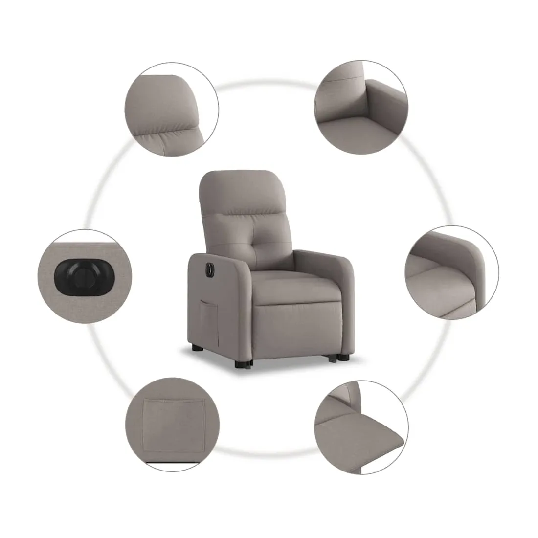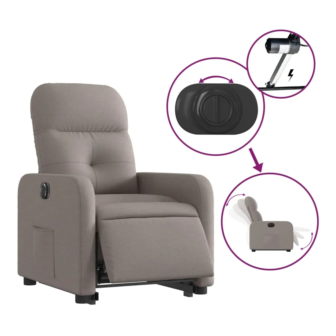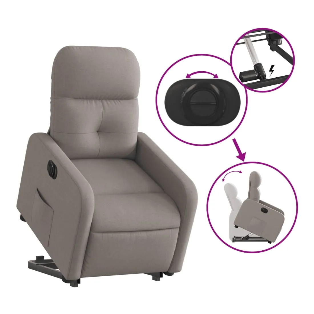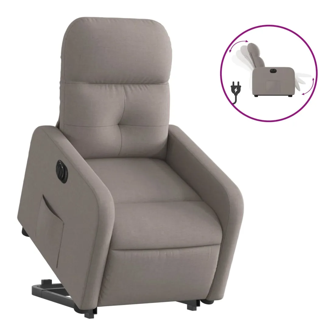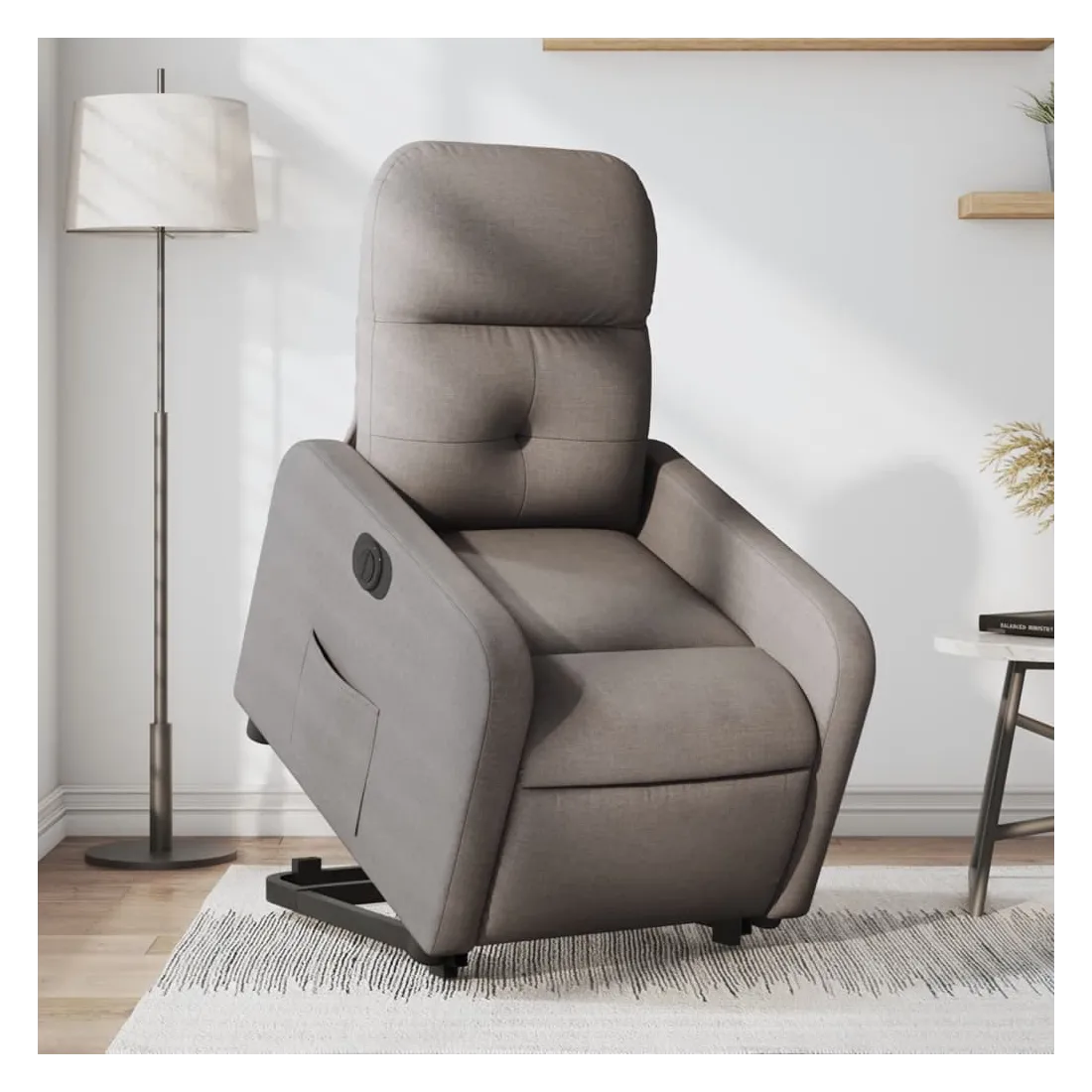 Asseyez-vous et détendez-vous dans ce fauteuil inclinable électrique très confortable ! Fonction de levage électrique : ce fauteuil inclinable pour personnes âgées est équipé d'un moteur électrique pour la fonction de levage. Grâce à la fonction qui pousse toute la chaise vers le haut, vous pouvez facilement vous tenir debout sans stresser votre dos et vos genoux en appuyant simplement sur le bouton.Fonction d'inclinaison électrique : ce fauteuil inclinable est également équipé d'un moteur électrique qui permet de régler automatiquement le repose-pied et le dossier dans n'importe quelle position, selon votre confort, en appuyant simplement sur le bouton situé sur le côté du fauteuil. Cette fonction permet une inclinaison maximale de 135 degrés. En outre, le dossier peut revenir automatiquement à sa position d'origine par une simple pression sur le bouton.Expérience d'assise confortable : le siège, le dossier et les larges accoudoirs bien rembourrés recouverts de tissu procurent une sensation confortable et chaleureuse, vous permettant de vous sentir enveloppé lorsque vous êtes assis. Le tissu présente un aspect simple et épuré et est respirant et durable.Poche latérale pratique : ce fauteuil est doté d'une poche latérale pour vous permettre de garder vos objets essentiels à portée de main.Cadre solide et stable : le cadre en bois et en métal offre une structure solide et une grande stabilité. Ce fauteuil inclinable est confortable et durable.
