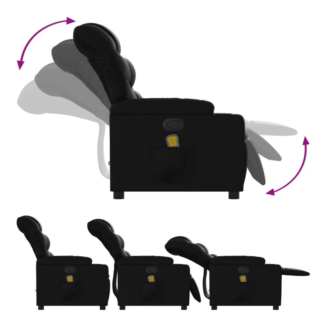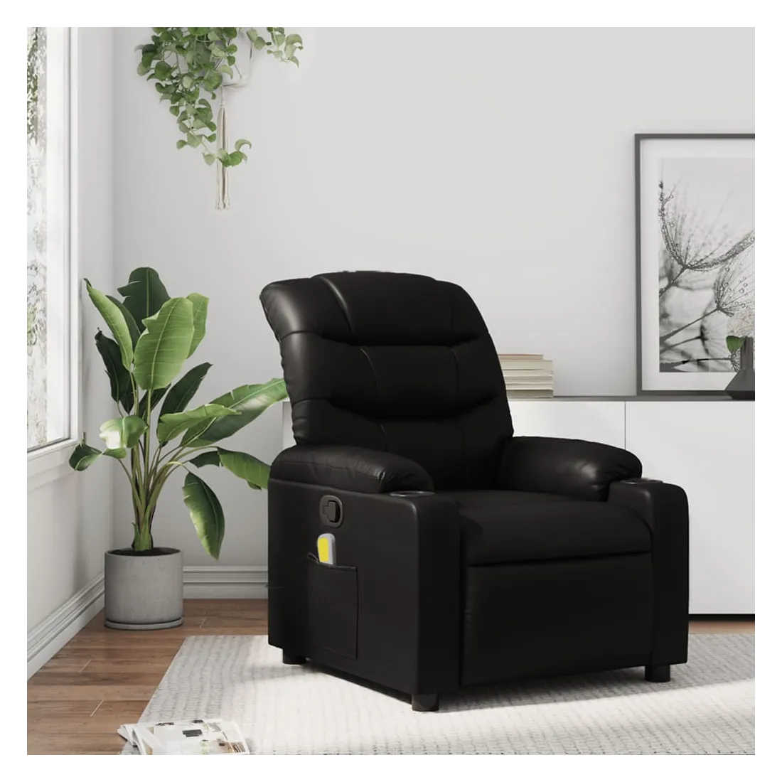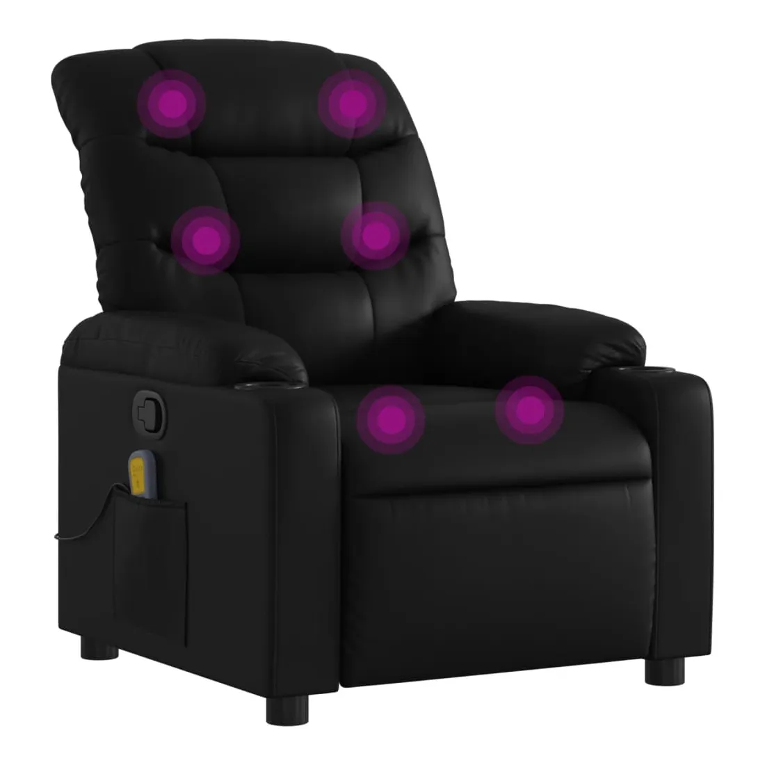 Asseyez-vous et détendez-vous dans ce fauteuil inclinable de massage très confortable ! Fonction d'inclinaison manuelle : ce fauteuil inclinable est doté d'une poignée du côté droit. Vous pouvez régler manuellement le repose-pieds et le dossier dans n'importe quelle position selon votre confort en tirant simplement sur la poignée. Cette fonction permet une inclinaison maximale de 135 degrés. De plus, le dossier peut revenir rapidement à sa position d'origine en tirant simplement sur la poignée.Fonction de vibration : les 6 points de massage vous permettent de faire l'expérience d'un massage mieux ciblé. De plus, la télécommande incluse vous permet de choisir différents programmes de massage. La fonction de massage est alimentée par le connecteur USB, mais la source d'alimentation USB 5V certifiée n'est pas incluse.Expérience de siège confortable : le siège, le dossier et les larges accoudoirs rembourrés épais recouverts de similicuir procurent une sensation confortable, vous faisant vous sentir enlacé lorsque vous êtes assis. Le similicuir est un matériau très résistant. Il est résistant aux taches, ce qui le rend facile à nettoyer avec un chiffon humide. La surface lisse donne également un aspect luxueux et la beauté du cuir véritable.Porte-gobelets et poche latérale pratiques : ce fauteuil dispose de deux porte-gobelets pratiques pour vos boissons et d'une poche latérale pour votre télécommande ou pour garder vos objets essentiels à portée de main.Cadre solide et stable : le cadre en bois et en métal offre une structure solide et une grande stabilité. Ce fauteuil inclinable est confortable et durable.
