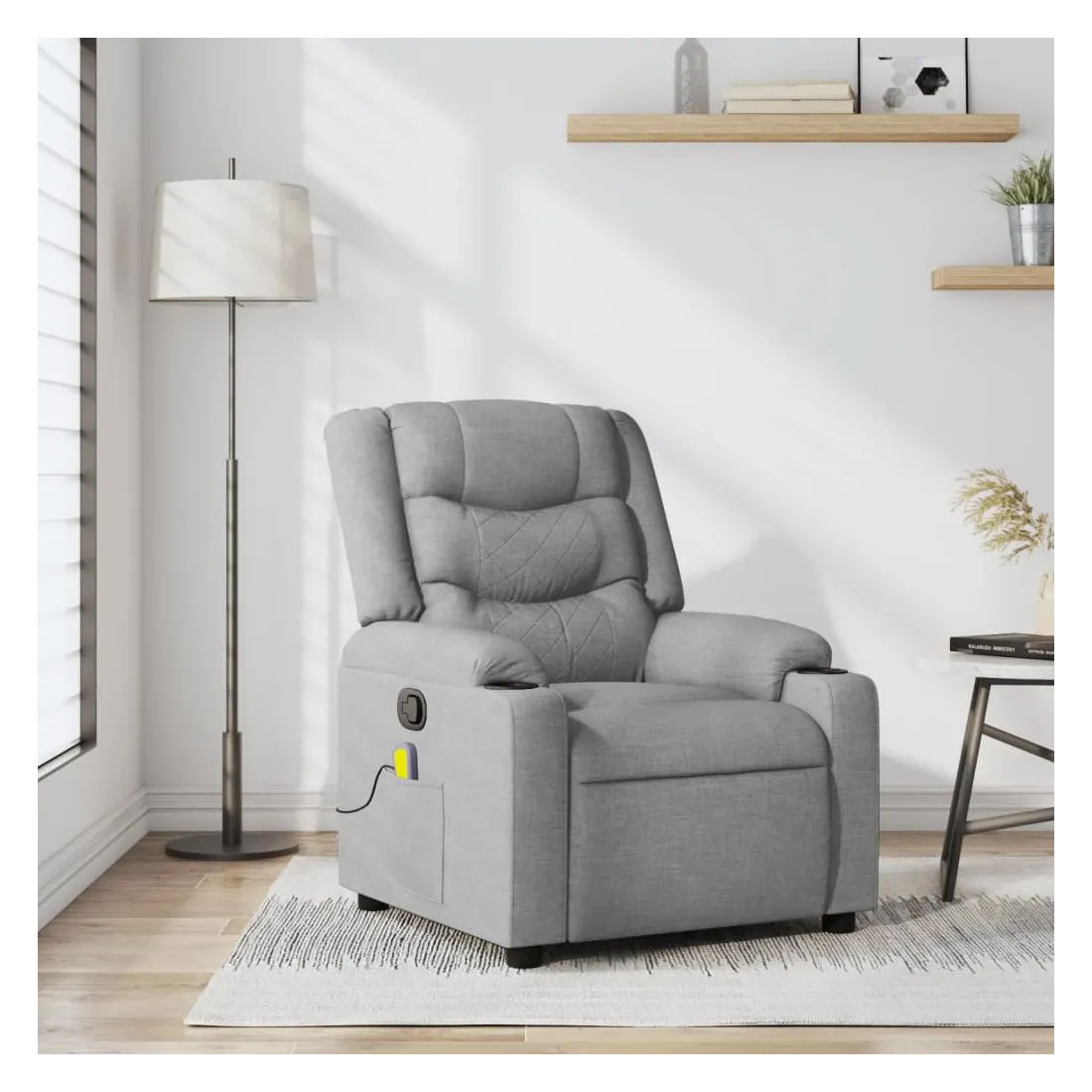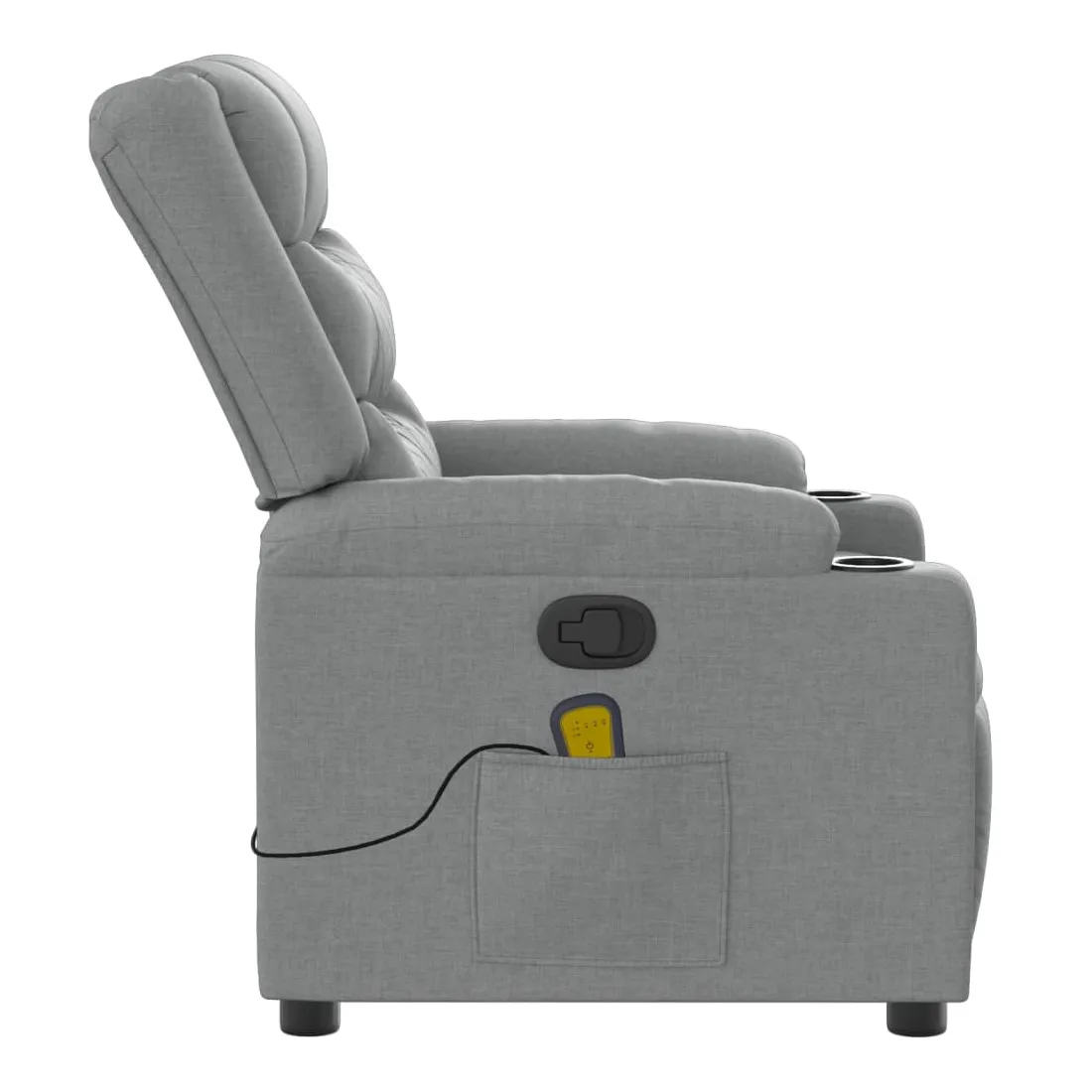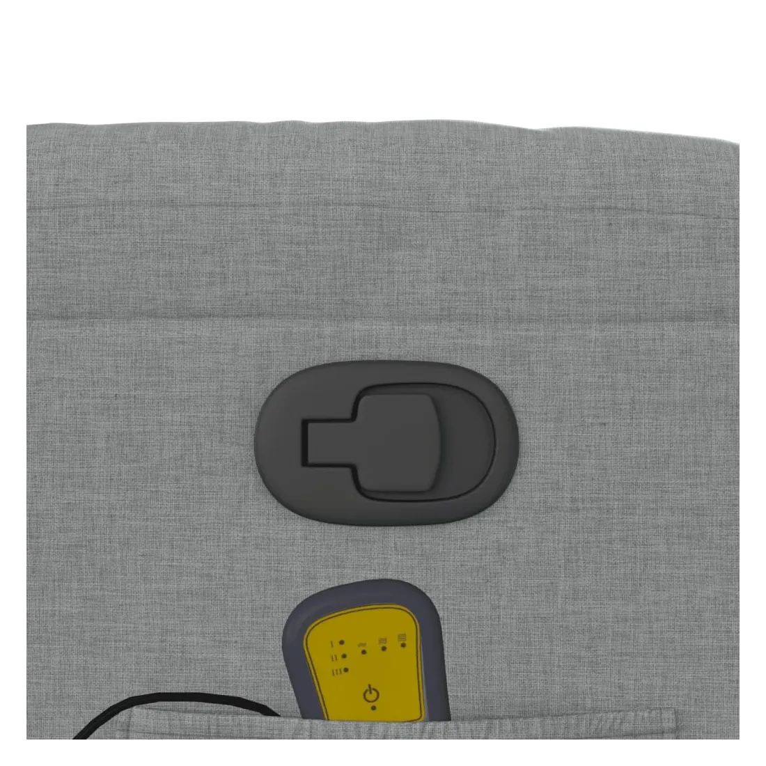 Asseyez-vous et laissez-vous aller dans ce fauteuil inclinable massant très confortable ! Fonction d'inclinaison manuelle : Ce fauteuil inclinable est doté d'une poignée sur le côté droit. Vous pouvez régler manuellement le repose-pieds et le dossier dans n'importe quelle position selon votre confort en tirant simplement sur la poignée. Cette fonction permet une inclinaison maximale de 135 degrés. De plus, le dossier peut revenir rapidement à sa position initiale en tirant facilement sur la poignée.Fonction de vibration : Les 6 points de massage vous permettent de bénéficier d'un massage mieux ciblé. De plus, la télécommande incluse vous permet de choisir différents programmes de massage. La fonction de massage est alimentée par le connecteur USB, mais la source d'alimentation USB 5 V certifiée n'est pas incluse.Expérience d'assise confortable : Le siège, le dossier et les larges accoudoirs recouverts de tissu, au rembourrage épais, procurent une sensation de confort et de chaleur, vous donnant l'impression d'être bien assis. Le tissu, au look simple et épuré, est respirant et résistant.Porte-gobelets pratiques et poche latérale : Ce fauteuil est doté de deux porte-gobelets pratiques pour vos boissons et d'une poche latérale pour votre télécommande ou pour garder vos objets essentiels à portée de main.Cadre solide et stable : Le cadre en bois et en métal offre une structure solide et stable. Ce fauteuil inclinable est confortable et durable.