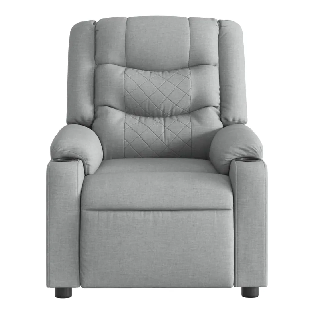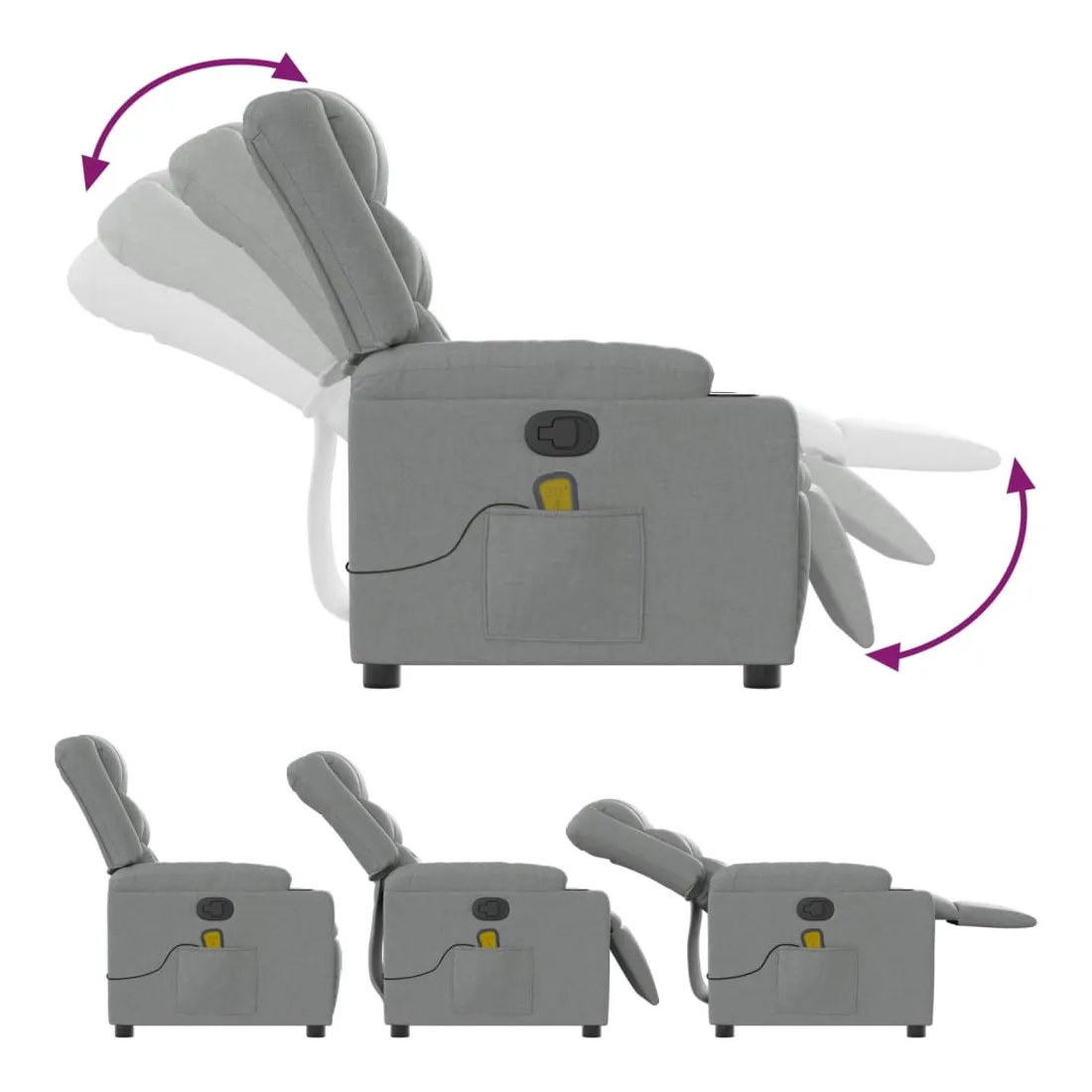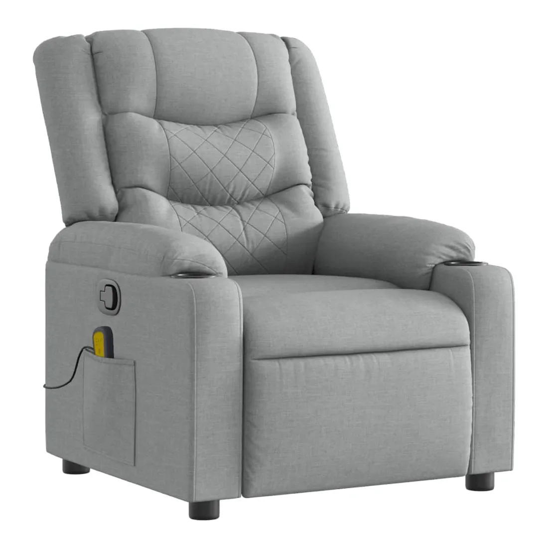 Asseyez-vous et laissez-vous aller dans ce fauteuil inclinable massant très confortable ! Fonction d'inclinaison manuelle : Ce fauteuil inclinable est doté d'une poignée sur le côté droit. Vous pouvez régler manuellement le repose-pieds et le dossier dans n'importe quelle position selon votre confort en tirant simplement sur la poignée. Cette fonction permet une inclinaison maximale de 135 degrés. De plus, le dossier peut revenir rapidement à sa position initiale en tirant facilement sur la poignée.Fonction de vibration : Les 6 points de massage vous permettent de bénéficier d'un massage mieux ciblé. De plus, la télécommande incluse vous permet de choisir différents programmes de massage. La fonction de massage est alimentée par le connecteur USB, mais la source d'alimentation USB 5 V certifiée n'est pas incluse.Expérience d'assise confortable : Le siège, le dossier et les larges accoudoirs recouverts de tissu, au rembourrage épais, procurent une sensation de confort et de chaleur, vous donnant l'impression d'être bien assis. Le tissu, au look simple et épuré, est respirant et résistant.Porte-gobelets pratiques et poche latérale : Ce fauteuil est doté de deux porte-gobelets pratiques pour vos boissons et d'une poche latérale pour votre télécommande ou pour garder vos objets essentiels à portée de main.Cadre solide et stable : Le cadre en bois et en métal offre une structure solide et stable. Ce fauteuil inclinable est confortable et durable.
