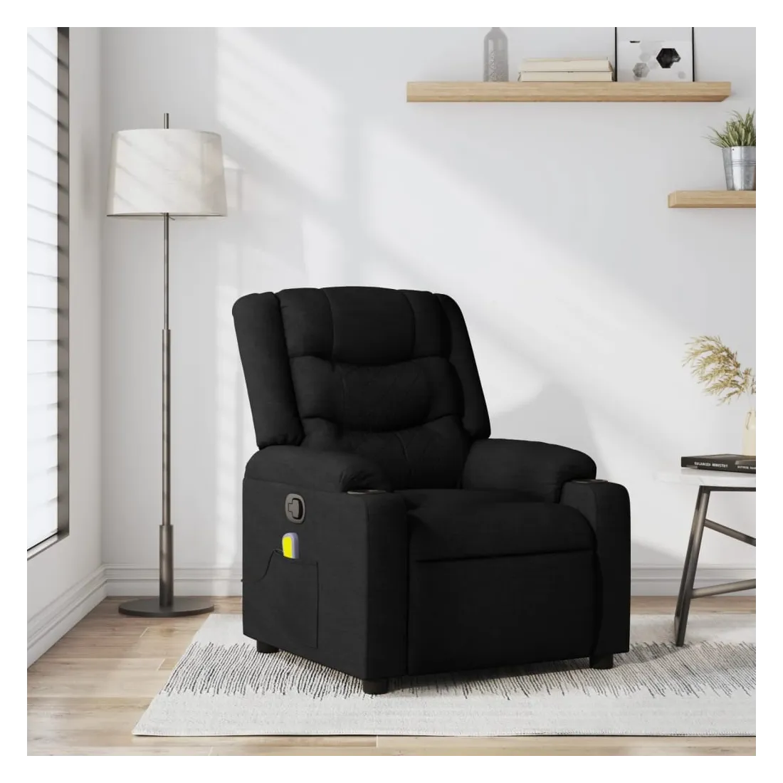 Asseyez-vous et détendez-vous dans ce fauteuil inclinable de massage très confortable ! Fonction d'inclinaison manuelle : ce fauteuil inclinable est doté d'une poignée du côté droit. Vous pouvez régler manuellement le repose-pieds et le dossier dans n'importe quelle position selon votre confort en tirant simplement sur la poignée. Cette fonction permet une inclinaison maximale de 135 degrés. De plus, le dossier peut revenir rapidement à sa position d'origine en tirant simplement sur la poignée.Fonction de vibration : les 6 points de massage vous permettent de faire l'expérience d'un massage mieux ciblé. De plus, la télécommande incluse vous permet de choisir différents programmes de massage. La fonction de massage est alimentée par le connecteur USB, mais la source d'alimentation USB 5V certifiée n'est pas incluse.Expérience d'assise confortable : le siège, le dossier et les larges accoudoirs bien rembourrés recouverts de tissu procurent une sensation confortable et chaleureuse, vous permettant de vous sentir enveloppé lorsque vous êtes assis. Le tissu présente un aspect simple et épuré et est respirant et durable.Porte-gobelets et poche latérale pratiques : ce fauteuil dispose de deux porte-gobelets pratiques pour vos boissons et d'une poche latérale pour votre télécommande ou pour garder vos objets essentiels à portée de main.Cadre solide et stable : le cadre en bois et en métal offre une structure solide et une grande stabilité. Ce fauteuil inclinable est confortable et durable.