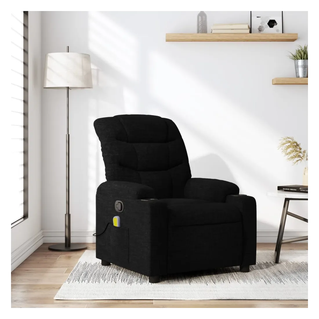 Asseyez-vous et détendez-vous dans ce fauteuil inclinable de massage très confortable ! Fonction d'inclinaison manuelle : ce fauteuil inclinable est doté d'une poignée du côté droit. Vous pouvez régler manuellement le repose-pieds et le dossier dans n'importe quelle position selon votre confort en tirant simplement sur la poignée. Cette fonction permet une inclinaison maximale de 135 degrés. De plus, le dossier peut revenir rapidement à sa position d'origine en tirant simplement sur la poignée.Fonction de vibration : les 6 points de massage vous permettent de faire l'expérience d'un massage mieux ciblé. De plus, la télécommande incluse vous permet de choisir différents programmes de massage. La fonction de massage est alimentée par le connecteur USB, mais la source d'alimentation USB 5V certifiée n'est pas incluse.Expérience d'assise confortable : le siège, le dossier et les larges accoudoirs bien rembourrés recouverts de tissu procurent une sensation confortable et chaleureuse, vous permettant de vous sentir enveloppé lorsque vous êtes assis. Le tissu présente un aspect simple et épuré et est respirant et durable.Porte-gobelets et poche latérale pratiques : ce fauteuil dispose de deux porte-gobelets pratiques pour vos boissons et d'une poche latérale pour votre télécommande ou pour garder vos objets essentiels à portée de main.Cadre solide et stable : le cadre en bois et en métal offre une structure solide et une grande stabilité. Ce fauteuil inclinable est confortable et durable.