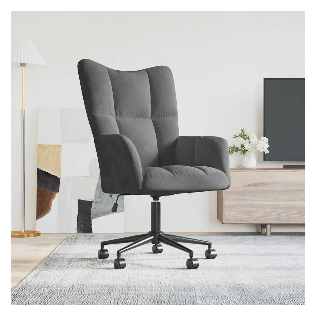 Cette chaise de relaxation, au design chic et élégant, apportera une touche de modernité à votre décoration. Avec quelques blocs, cette chaise de bureau est esthétiquement agréable. Grâce à sa mousse bien rembourrée recouverte de velours doux au toucher, vous pourrez profiter d'un confort optimal pendant votre temps d'assise. Équipé de mécanisme de levage à gaz, ce fauteuil de salon est réglable en hauteur, vous aidant à trouver la position parfaite. Ses roulettes et son pivotement à 360 degrés signifient également une fantastique flexibilité de mouvement. De plus, soutenu par un cadre en acier et des pieds croisés, le fauteuil de relaxation est stable et durable.
