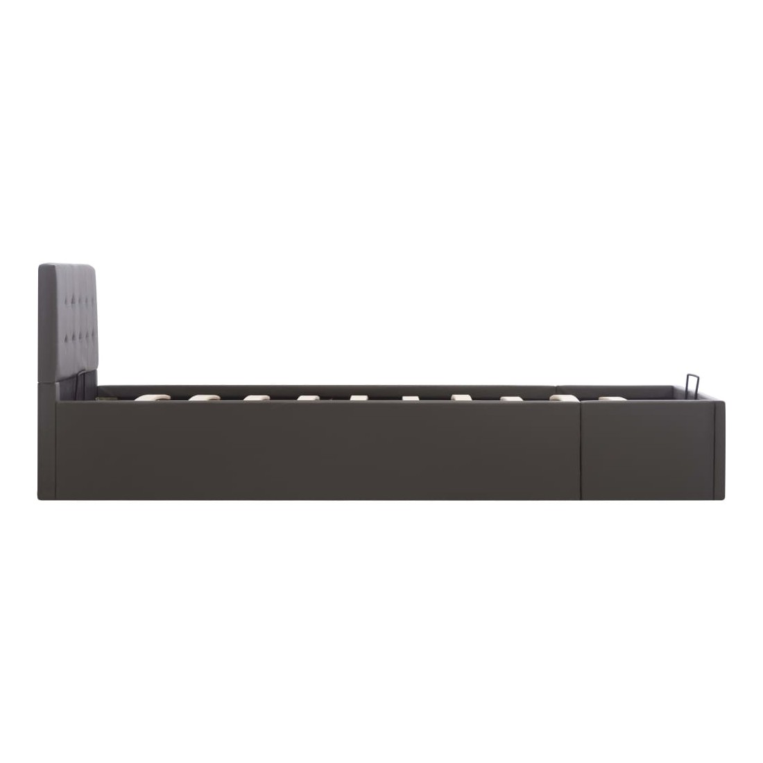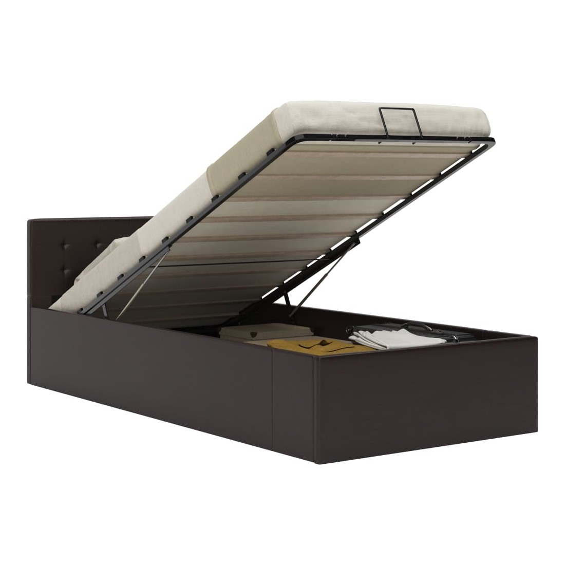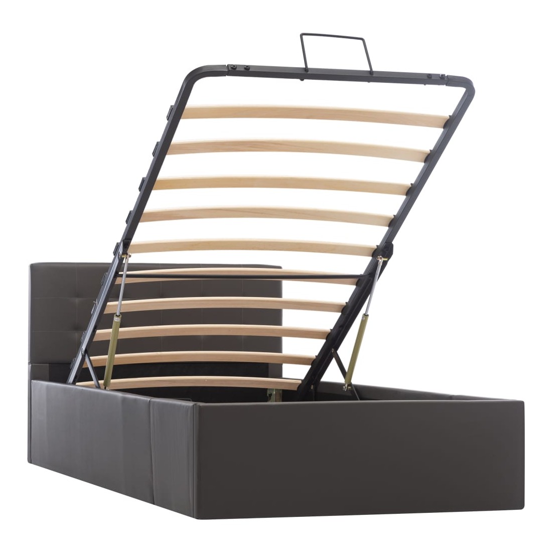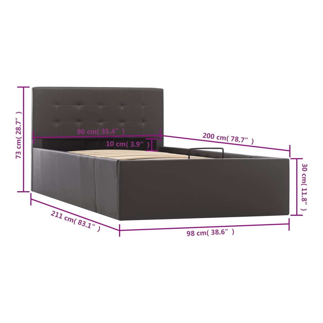 Ajoutez instantanément un goût moderne impressionnant à votre chambre à coucher grâce à notre cadre de lit en similicuir hydraulique ! Ce lit simple se caractérise par un design simple mais élégant, ainsi que par une construction solide, car il est fabriqué en MDF robuste et résistant. Ce lit rembourré transforme l'espace inutilisé sous le matelas en espace de rangement, avec suffisamment d'espace pour ranger les vêtements, les draps, les couvertures, etc. Le mécanisme de levage à gaz hydraulique facilite le soulèvement du matelas. Le sommier à lattes restera droit une fois soulevé pour vous laisser les deux mains libres d'enlever ou de stocker des articles en dessous. Le cadre en acier enduit de poudre et les lattes en contreplaqué ajoutent à la robustesse et à la durabilité du lit. Rembourré de similicuir brillant, ce lit à espace de rangement est accueillant et facile d'entretien. Ce produit est facile à assembler. Ce meuble de chambre à coucher convient à un matelas de 90 x 200 cm. Veuillez noter que la livraison inclut un cadre de lit seulement ; un matelas n'est pas inclus. Vous pouvez chercher le matelas correspondant dans notre boutique.