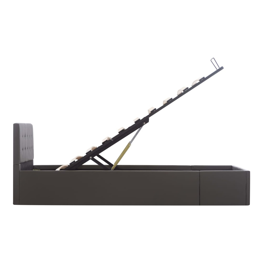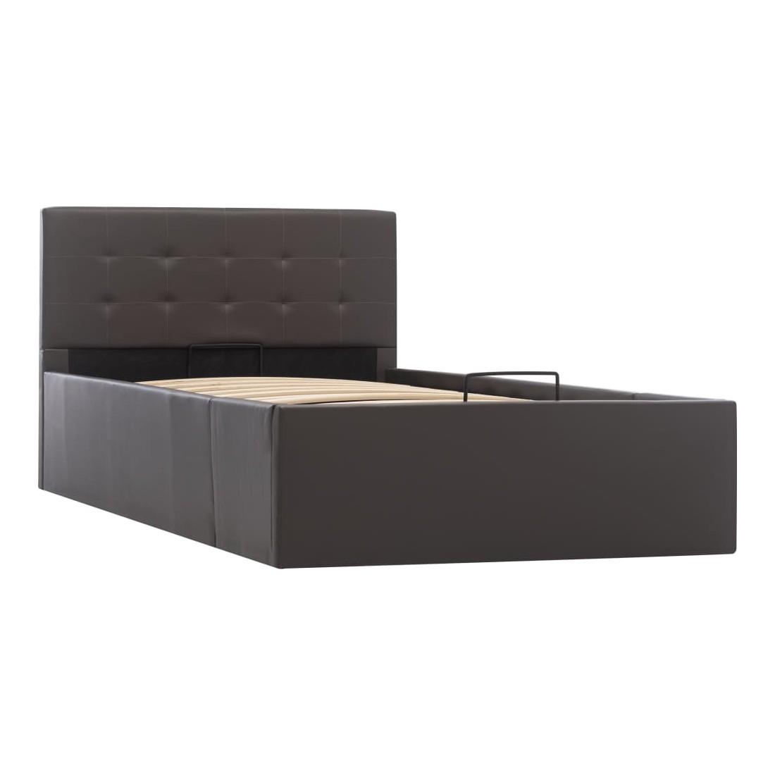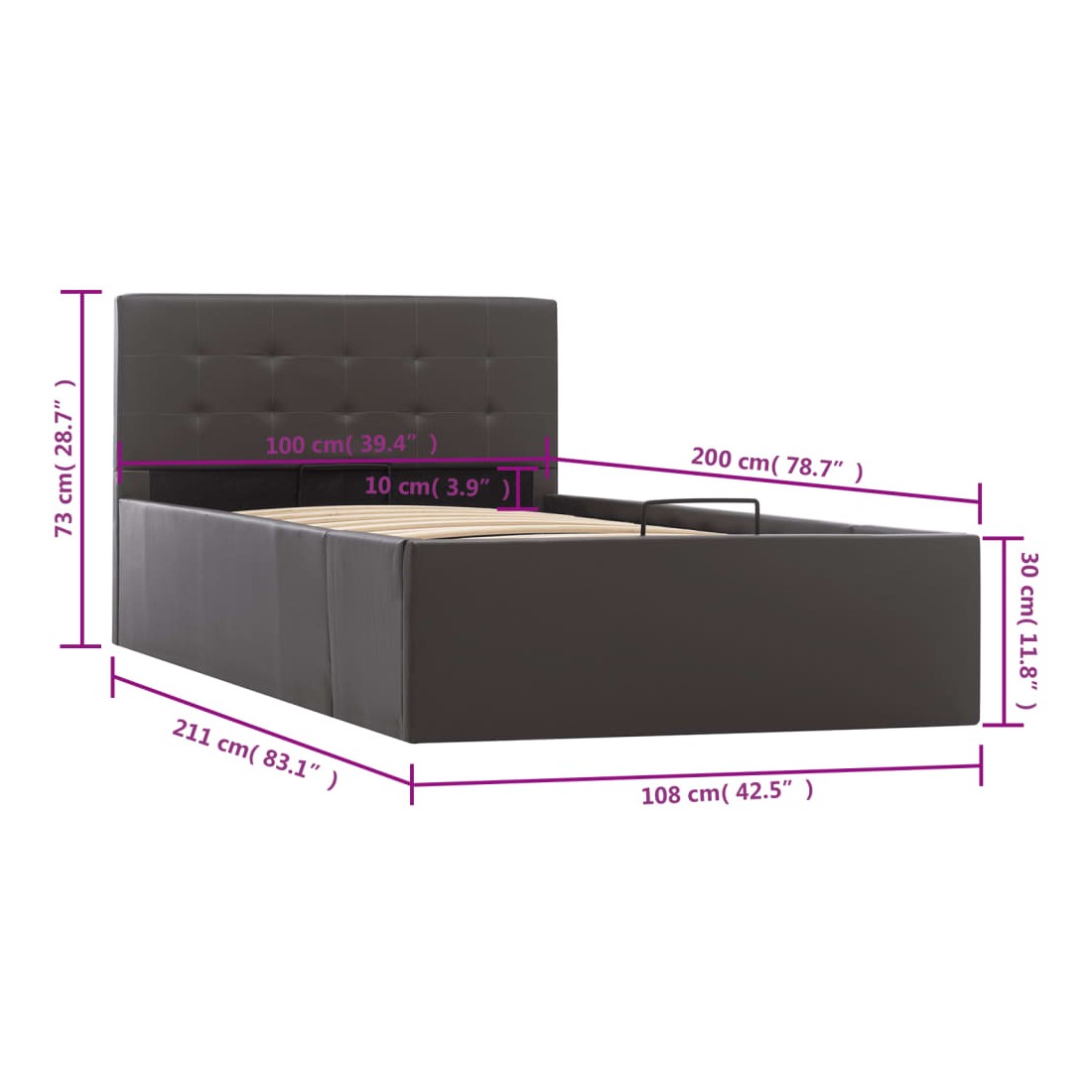 Ajoutez instantanément un goût moderne impressionnant à votre chambre à coucher grâce à notre cadre de lit en similicuir hydraulique ! Ce lit simple se caractérise par un design simple mais élégant, ainsi que par une construction solide, car il est fabriqué en MDF robuste et résistant. Ce lit rembourré transforme l'espace inutilisé sous le matelas en espace de rangement, avec suffisamment d'espace pour ranger les vêtements, les draps, les couvertures, etc. Le mécanisme de levage à gaz hydraulique facilite le soulèvement du matelas. Le sommier à lattes restera droit une fois soulevé pour vous laisser les deux mains libres d'enlever ou de stocker des articles en dessous. Le cadre en acier enduit de poudre et les lattes en contreplaqué ajoutent à la robustesse et à la durabilité du lit. Rembourré de similicuir brillant, ce lit à espace de rangement est accueillant et facile d'entretien. Ce produit est facile à assembler. Ce meuble de chambre à coucher convient à un matelas de 100 x 200 cm. Veuillez noter que la livraison inclut un cadre de lit seulement ; un matelas n'est pas inclus. Vous pouvez chercher le matelas correspondant dans notre boutique.