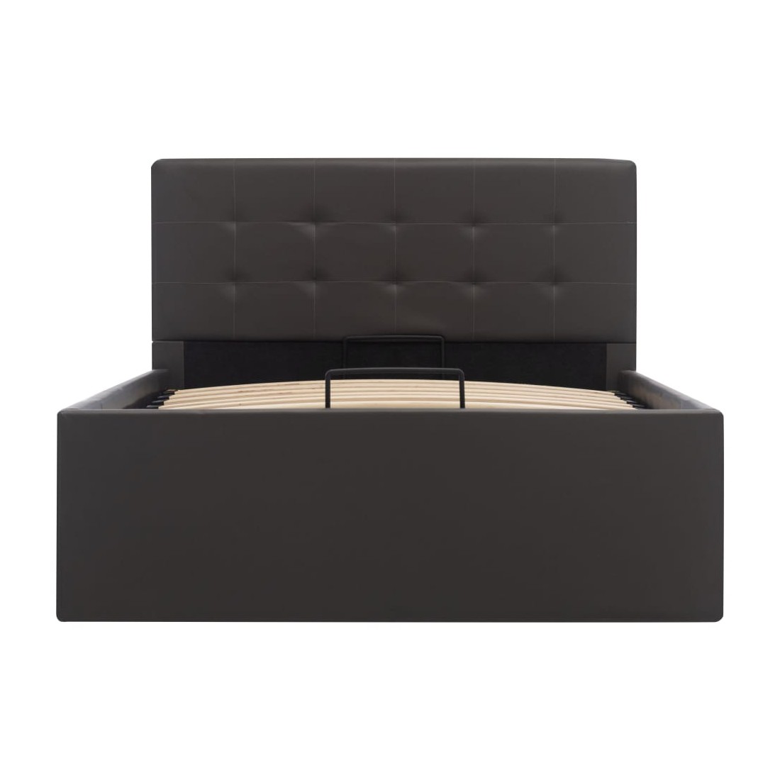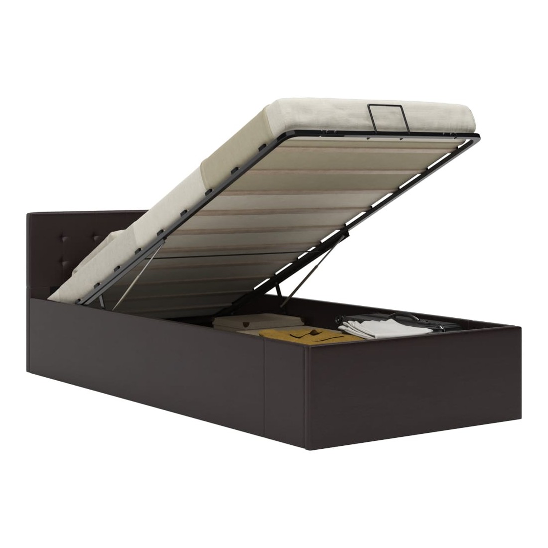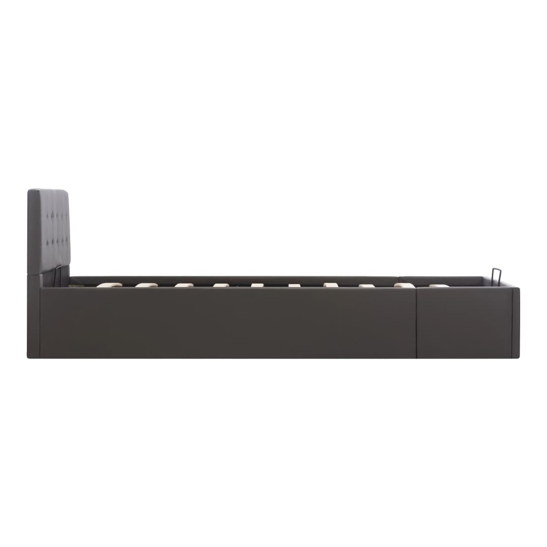 Ajoutez instantanément un goût moderne impressionnant à votre chambre à coucher grâce à notre cadre de lit en similicuir hydraulique ! Ce lit simple se caractérise par un design simple mais élégant, ainsi que par une construction solide, car il est fabriqué en MDF robuste et résistant. Ce lit rembourré transforme l'espace inutilisé sous le matelas en espace de rangement, avec suffisamment d'espace pour ranger les vêtements, les draps, les couvertures, etc. Le mécanisme de levage à gaz hydraulique facilite le soulèvement du matelas. Le sommier à lattes restera droit une fois soulevé pour vous laisser les deux mains libres d'enlever ou de stocker des articles en dessous. Le cadre en acier enduit de poudre et les lattes en contreplaqué ajoutent à la robustesse et à la durabilité du lit. Rembourré de similicuir brillant, ce lit à espace de rangement est accueillant et facile d'entretien. Ce produit est facile à assembler. Ce meuble de chambre à coucher convient à un matelas de 100 x 200 cm. Veuillez noter que la livraison inclut un cadre de lit seulement ; un matelas n'est pas inclus. Vous pouvez chercher le matelas correspondant dans notre boutique.
