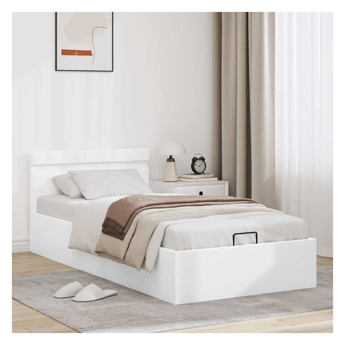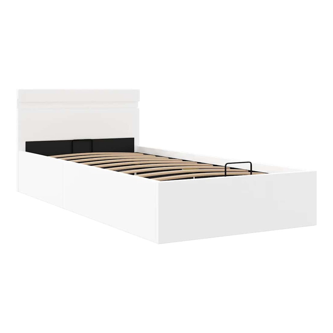 Ajoutez instantanément un goût moderne impressionnant à votre chambre à coucher grâce à notre cadre de lit en similicuir hydraulique ! Ce lit simple se caractérise par un design simple mais élégant, ainsi que par une construction solide, car il est fabriqué en MDF robuste et résistant. Ce lit rembourré transforme l'espace inutilisé sous le matelas en espace de rangement, avec suffisamment d'espace pour ranger les vêtements, les draps, les couvertures, etc. Le mécanisme de levage à gaz hydraulique facilite le soulèvement du matelas. Le sommier à lattes restera droit une fois soulevé pour vous laisser les deux mains libres d'enlever ou de stocker des articles en dessous. Le cadre en acier enduit de poudre et les lattes en contreplaqué ajoutent à la robustesse et à la durabilité du lit. Rembourré de similicuir brillant, ce lit semble accueillant et facile à entretenir. Ce meuble de chambre à coucher convient à un matelas de 100 x 200 cm. Ce lit est équipé de lumières LED qui peuvent être facilement réglées pour créer un spectacle lumineux personnalisé. Vous pouvez personnaliser les modes, les couleurs et la luminosité pour améliorer l'ambiance de votre espace intérieur. Ce produit est facile à assembler. Veuillez noter que la livraison inclut un cadre de lit seulement ; un matelas n'est pas inclus. Vous pouvez chercher le matelas correspondant dans notre boutique. Remarque : ce produit est doté d'un connecteur USB, mais la source d'alimentation certifiée de USB 5V n'est pas incluse.