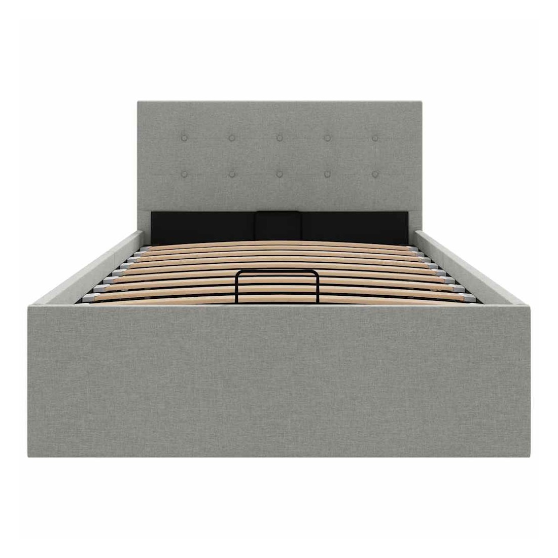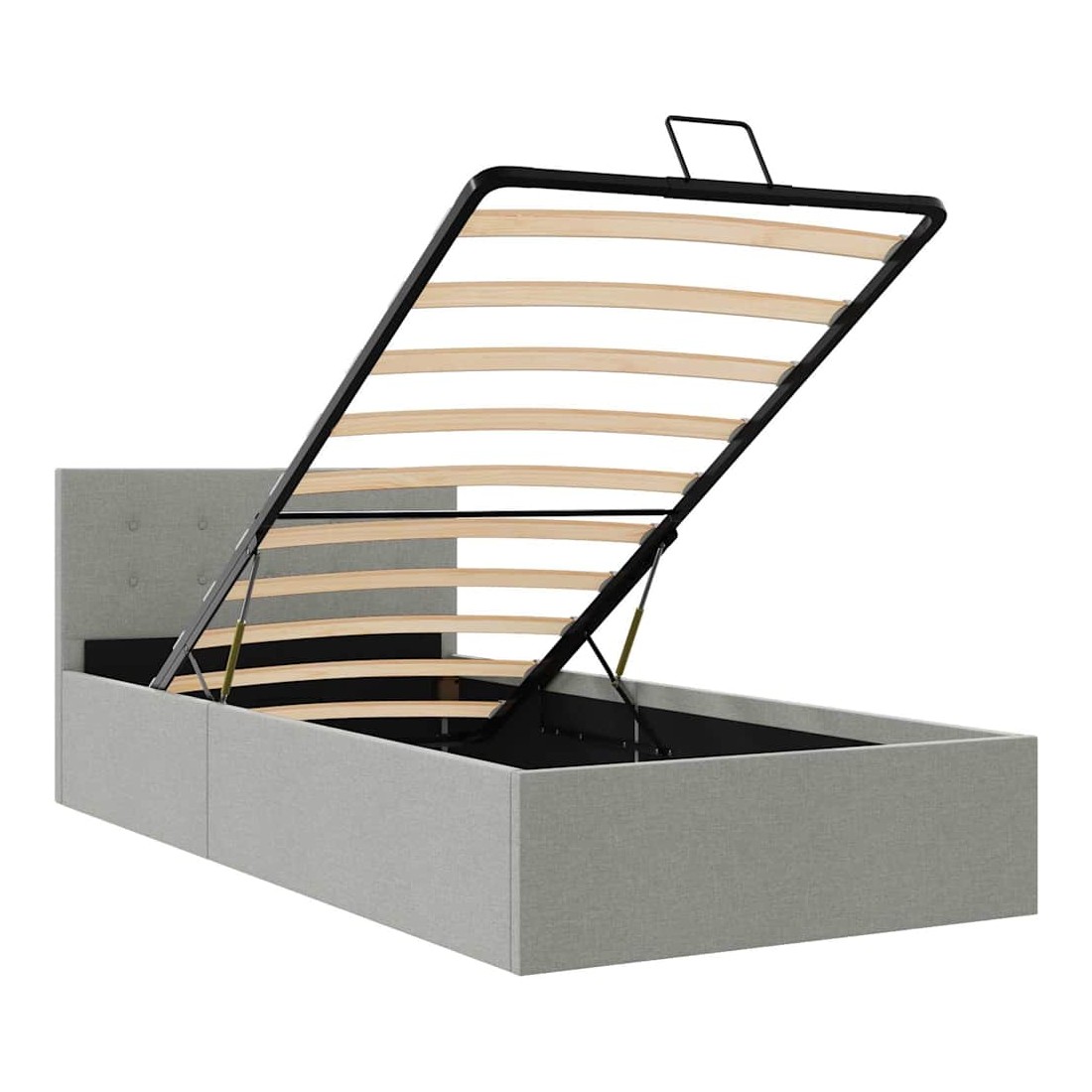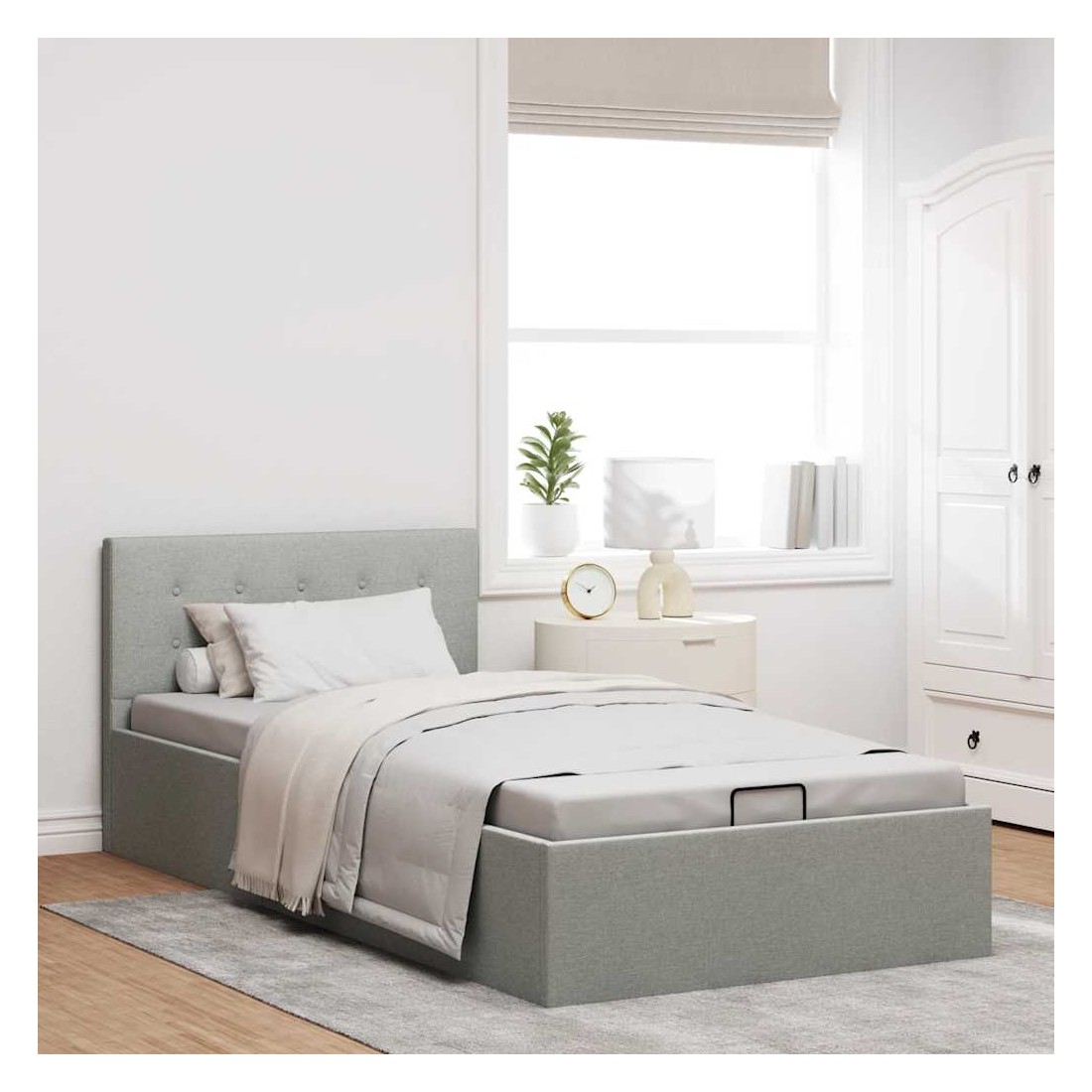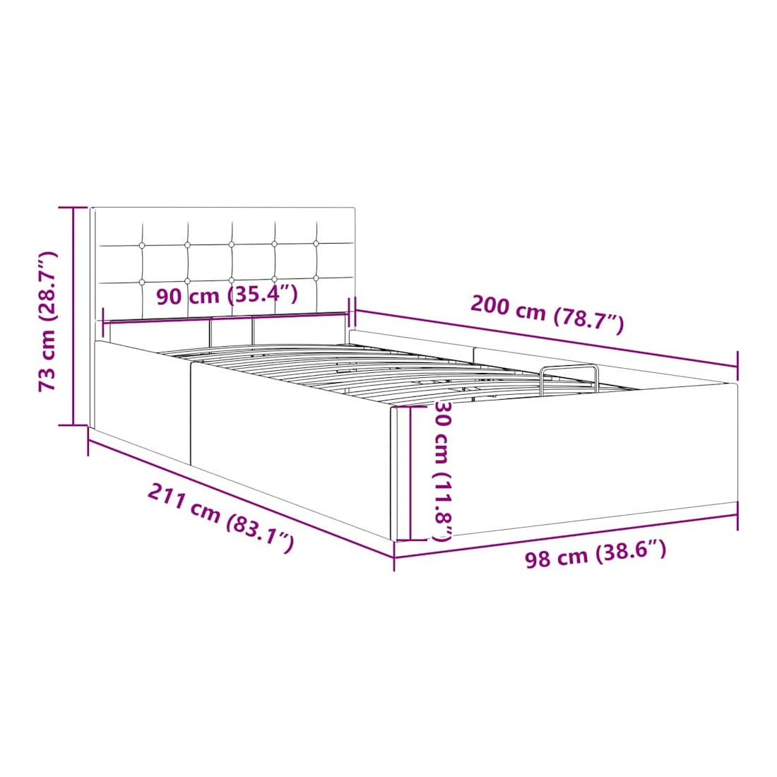 Ajoutez instantanément un goût moderne impressionnant à votre chambre à coucher grâce à notre cadre de lit en tissu hydraulique ! Ce lit simple se caractérise par un design simple mais élégant, ainsi que par une construction solide, car il est fabriqué en MDF robuste et résistant. Ce lit rembourré transforme l'espace inutilisé sous le matelas en espace de rangement, avec suffisamment d'espace pour ranger les vêtements, les draps, les couvertures, etc. Le mécanisme de levage à gaz hydraulique facilite le soulèvement du matelas. Le sommier à lattes restera droit une fois soulevé pour vous laisser les deux mains libres d'enlever ou de stocker des articles en dessous. Le cadre en acier enduit de poudre et les lattes en contreplaqué ajoutent à la robustesse et à la durabilité du lit. Rembourré de tissu durable, ce lit de rangement est accueillant et facile d'entretien. Ce produit est facile à assembler. Ce meuble de chambre à coucher convient à un matelas de 90 x 200 cm. Veuillez noter que la livraison inclut un cadre de lit seulement ; un matelas n'est pas inclus. Vous pouvez chercher le matelas correspondant dans notre boutique.