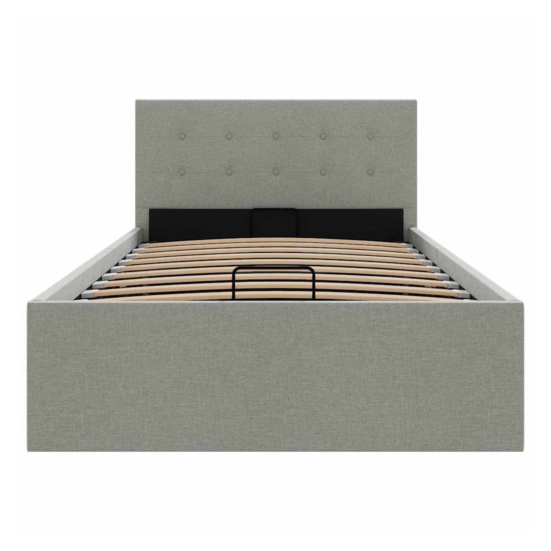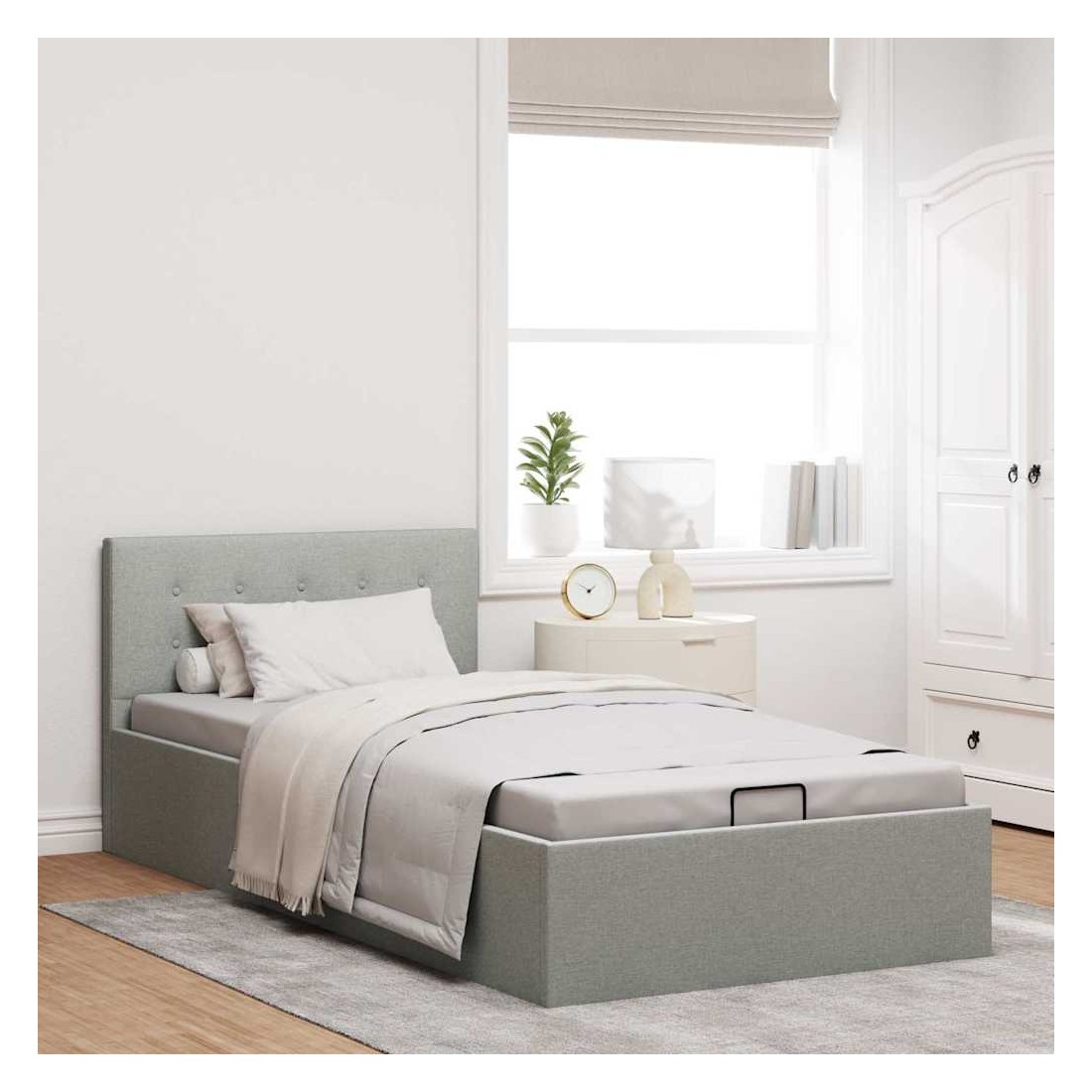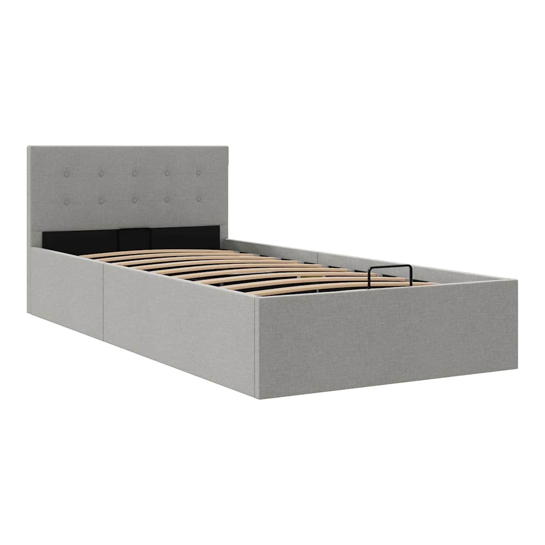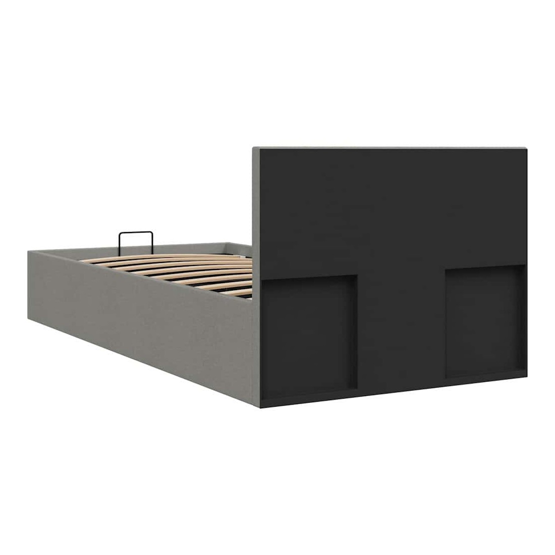 Ajoutez instantanément un goût moderne impressionnant à votre chambre à coucher grâce à notre cadre de lit en tissu hydraulique ! Ce lit simple se caractérise par un design simple mais élégant, ainsi que par une construction solide, car il est fabriqué en MDF robuste et résistant. Ce lit rembourré transforme l'espace inutilisé sous le matelas en espace de rangement, avec suffisamment d'espace pour ranger les vêtements, les draps, les couvertures, etc. Le mécanisme de levage à gaz hydraulique facilite le soulèvement du matelas. Le sommier à lattes restera droit une fois soulevé pour vous laisser les deux mains libres d'enlever ou de stocker des articles en dessous. Le cadre en acier enduit de poudre et les lattes en contreplaqué ajoutent à la robustesse et à la durabilité du lit. Rembourré de tissu durable, ce lit de rangement est accueillant et facile d'entretien. Ce produit est facile à assembler. Ce meuble de chambre à coucher convient à un matelas de 100 x 200 cm. Veuillez noter que la livraison inclut un cadre de lit seulement ; un matelas n'est pas inclus. Vous pouvez chercher le matelas correspondant dans notre boutique.