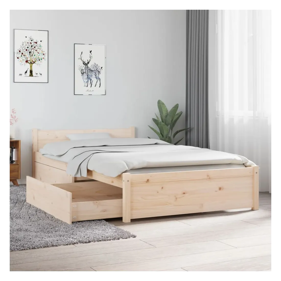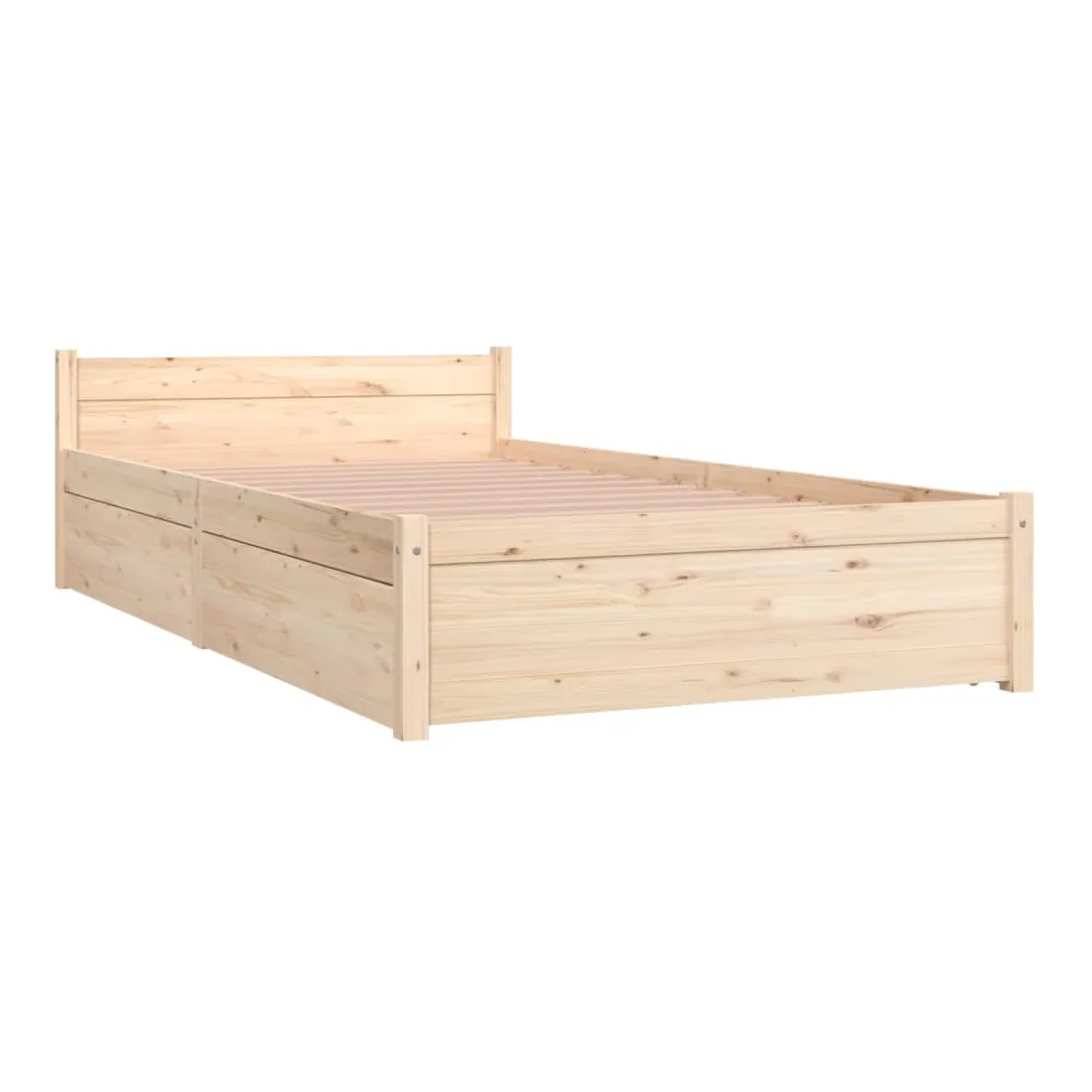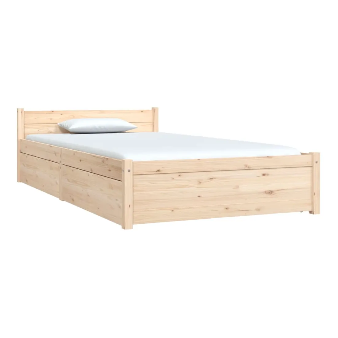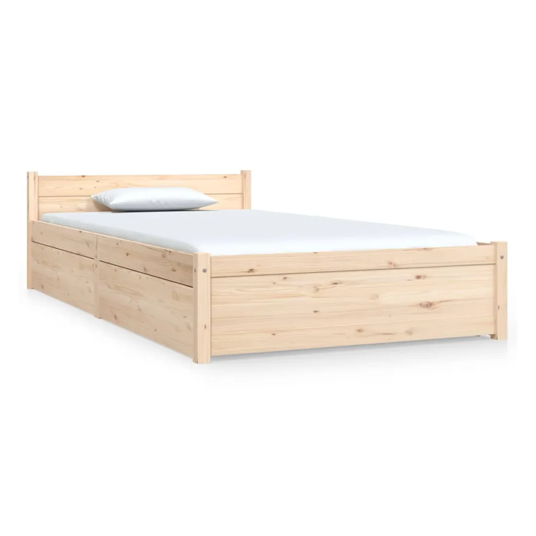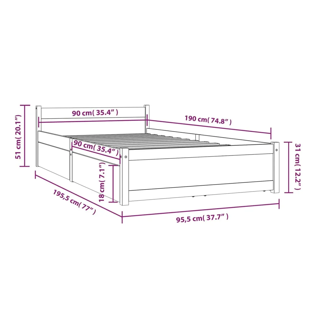 Avec un design simple mais intemporel, ce cadre de lit en bois sera un supplément vraiment pratique et décoratif à votre chambre à coucher. Bois de pin massif : le bois de pin massif est un matériau naturel magnifique. Le bois de pin a un grain droit et les nœuds donnent au matériau son aspect caractéristique et rustique.Lattes robustes : les lattes de contreplaqué assurent une bonne répartition du poids, garantissant que le matelas reste en place à chaque torsion de votre corps pendant le sommeil.Fonction de rangement : les tiroirs de lit inclus offrent suffisamment d'espace de rangement pour ranger vos articles essentiels, gardant votre pièce propre et bien rangée. Remarque :La livraison comprend uniquement le cadre de lit. Les matelas ne sont pas inclus. Vous pouvez consulter notre boutique pour trouver les matelas assortis.Ce cadre de lit convient à un matelas mesurant 90 x 190 cm (simple).