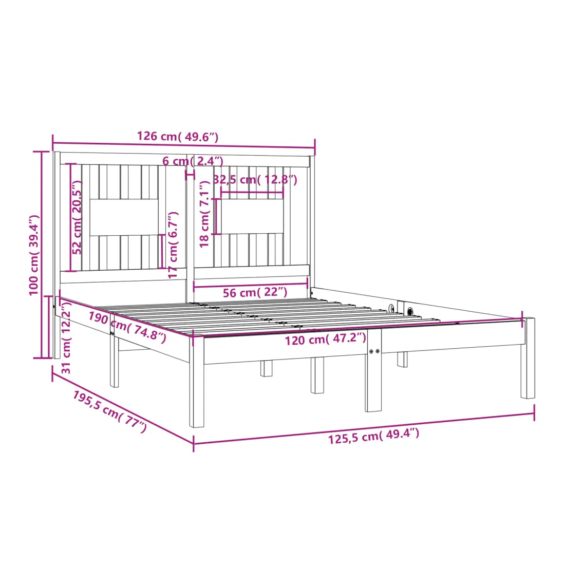 • Dimensions de la tête de lit : 126 x 4 x 100 cm (L x l x H)