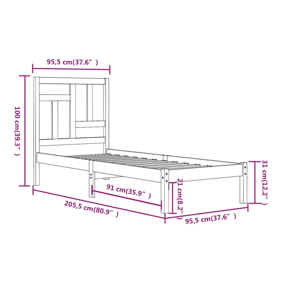 • Dimensions du cadre du lit : 205,5 x 95,5 x 31 cm (L x l x H)