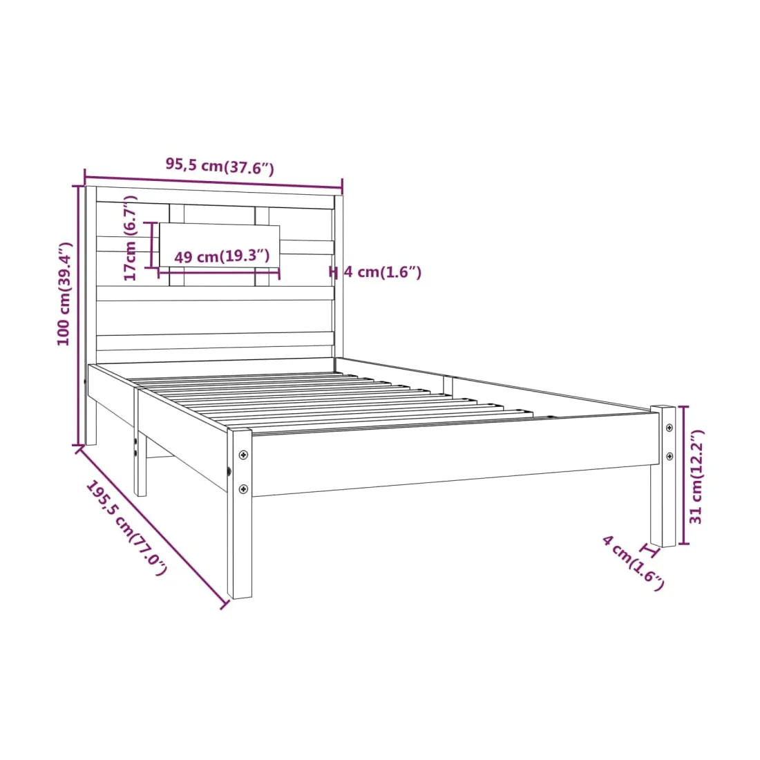 • Dimensions totales du cadre de lit : 195,5 x 95,5 x 100 cm (L x l x H)
