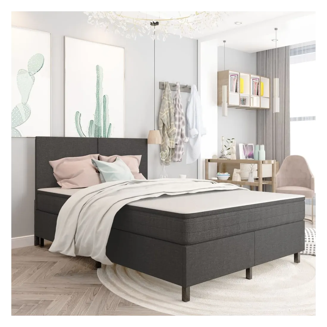 Ce sommier tapissier ajoute une touche de charme élégant à la décoration de votre chambre à coucher avec un design sobre. Le cadre de lit, en MDF et en métal, est extrêmement robuste et durable. Rembourré d'un tissu durable et résistant à l'usure, le lit dégage un look accueillant et il est facile à nettoyer. Doté d'une épaisseur supplémentaire d'env. 20 cm, le matelas à dessus de couette avec sommiers amortisseurs vous assure une bonne nuit de sommeil. Il est fait de mousse spécialement conçue avec des couches pour soulager les points de pression. La conception du ressort interne comporte des ressorts supplémentaires qui offrent un soutien optimal. C'est également une excellente solution pour les personnes lourdes et les personnes souffrant de transpiration excessive. Le matelas retro