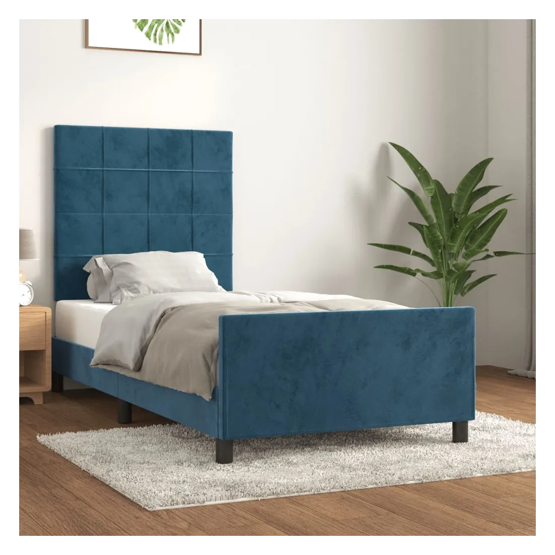 Obtenez une meilleure nuit de sommeil reposante grâce à ce cadre de lit avec tête de lit ! Il est un supplément accueillant à toute chambre à coucher. Velours doux : le velours est un tissu doux et luxueux qui se reconnaît à son tas dense de fibres uniformément coupées qui ont une touche lisse. Le tissu en velours présente un toucher doux distinctif, ce qui le rend confortable au toucher.Hauteur réglable : la tête de lit est réglable en hauteur selon vos préférences.Pieds de soutien : le lit est soutenu par des pieds robustes, qui assurent sa stabilité, sa sécurité et sa fermeté.Lattes de contreplaqué : les lattes de contreplaqué assurent une bonne répartition du poids, garantissant que le matelas reste en place à chaque torsion de votre corps pendant le sommeil.Excellent soutien : la tête de lit vous offre un excellent soutien du dos lorsque vous êtes assis dans votre lit pour lire ou regarder la télévision. Remarque :La livraison comprend uniquement un cadre de lit. Le matelas n'est pas inclus. Vous pouvez consulter notre boutique pour trouver les matelas assortis.Chaque produit est livré avec un manuel de montage dans la boîte pour un montage facile.