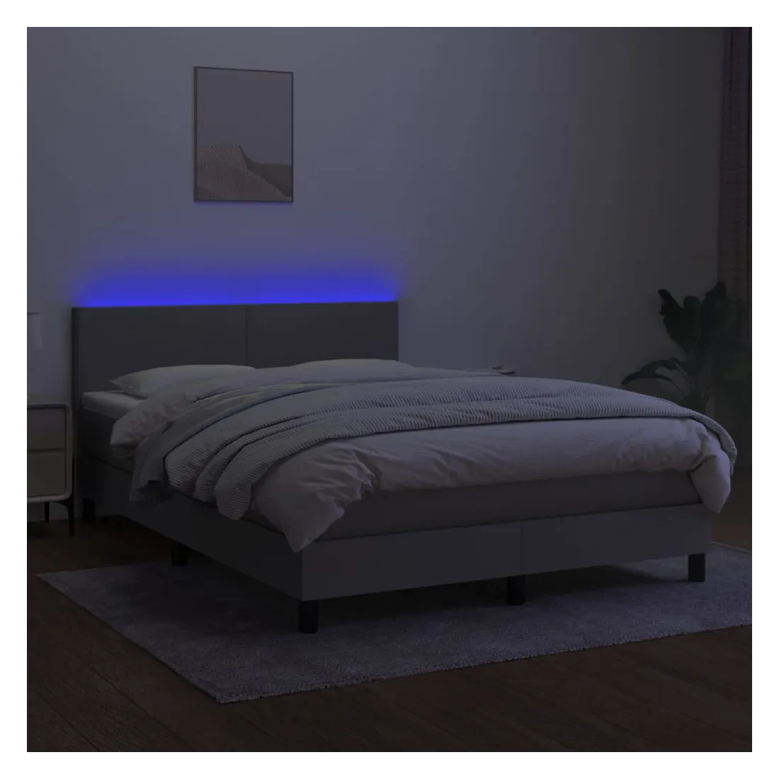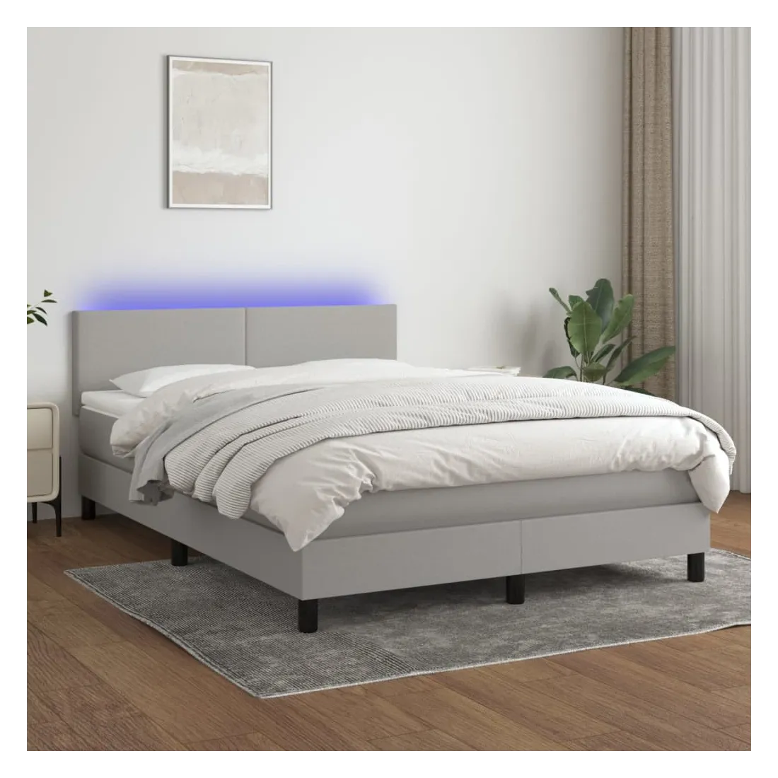 Utilisez ce sommier tapissier avec matelas et LED pour profiter d'un sommeil réparateur ! C'est le point central de votre chambre à coucher. Tissu durable : le tissu présente un aspect simple et épuré, et il est respirant et durable. Tête de lit pratique : la tête de lit est réglable en hauteur selon vos préférences. La tête de lit vous offre un excellent soutien du dos lorsque vous êtes assis dans votre lit pour lire ou regarder la télévision. Bande LED colorée : apportez de l'éclairage dans l'obscurité avec des lumières LED colorées ! Matelas à ressorts ensachés : le ressort ensaché individuel intégré est connu pour sa très haute qualité tout en assurant un haut niveau de durabilité et d'adaptabilité. Il peut absorber efficacement le bruit et les chocs causés par les sauts et les rot