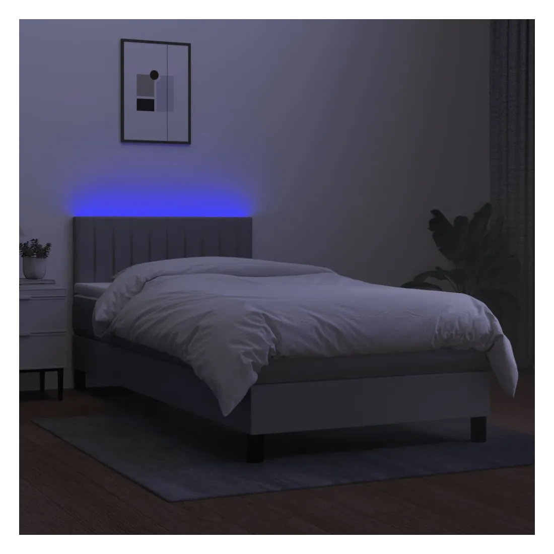 Utilisez ce sommier tapissier avec matelas et LED pour profiter d'un sommeil réparateur ! C'est le point central de votre chambre à coucher. Tissu durable : le tissu présente un aspect simple et épuré, et il est respirant et durable. Tête de lit pratique : la tête de lit est réglable en hauteur selon vos préférences. La tête de lit vous offre un excellent soutien du dos lorsque vous êtes assis dans votre lit pour lire ou regarder la télévision. Bande LED colorée : apportez de l'éclairage dans l'obscurité avec des lumières LED colorées ! Matelas à ressorts ensachés : le ressort ensaché individuel intégré est connu pour sa très haute qualité tout en assurant un haut niveau de durabilité et d'adaptabilité. Il peut absorber efficacement le bruit et les chocs causés par les sauts et les rot