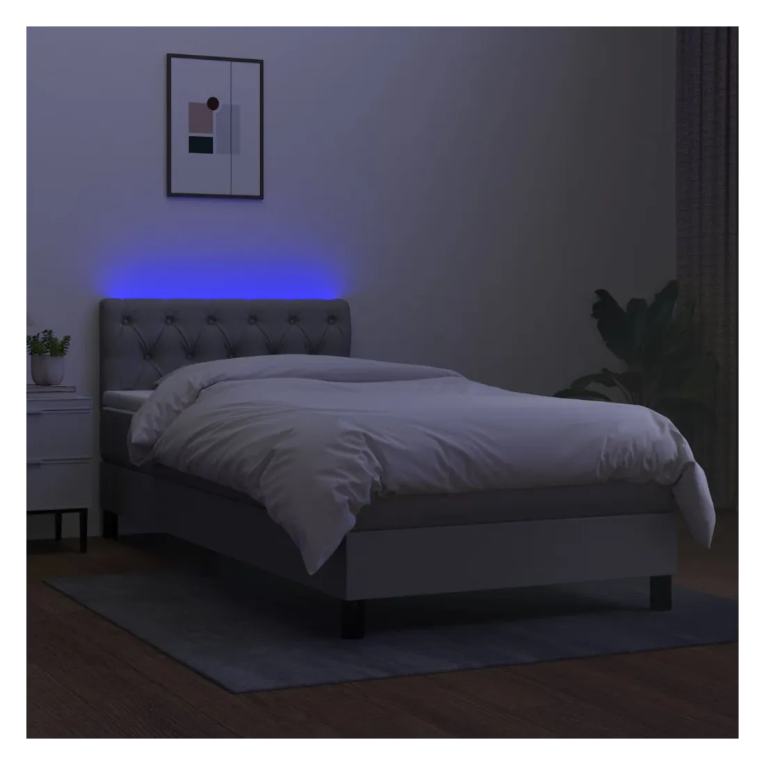 Utilisez ce sommier tapissier avec matelas et LED pour profiter d'un sommeil réparateur ! C'est le point central de votre chambre à coucher. Tissu durable : le tissu présente un aspect simple et épuré, et il est respirant et durable. Tête de lit pratique : la tête de lit est réglable en hauteur selon vos préférences. La tête de lit vous offre un excellent soutien du dos lorsque vous êtes assis dans votre lit pour lire ou regarder la télévision. Bande LED colorée : apportez de l'éclairage dans l'obscurité avec des lumières LED colorées ! Matelas à ressorts ensachés : le ressort ensaché individuel intégré est connu pour sa très haute qualité tout en assurant un haut niveau de durabilité et d'adaptabilité. Il peut absorber efficacement le bruit et les chocs causés par les sauts et les rot