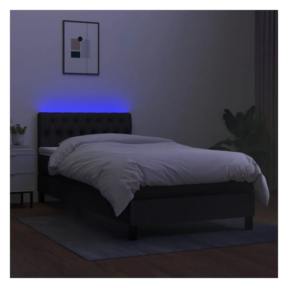 Utilisez ce sommier tapissier avec matelas et LED pour profiter d'un sommeil réparateur ! C'est le point central de votre chambre à coucher. Tissu durable : le tissu présente un aspect simple et épuré, et il est respirant et durable.Tête de lit pratique : la tête de lit est réglable en hauteur selon vos préférences. La tête de lit vous offre un excellent soutien du dos lorsque vous êtes assis dans votre lit pour lire ou regarder la télévision.Bande LED colorée : apportez de l'éclairage dans l'obscurité avec des lumières LED colorées !Matelas à ressorts ensachés : le ressort ensaché individuel intégré est connu pour sa très haute qualité tout en assurant un haut niveau de durabilité et d'adaptabilité. Il peut absorber efficacement le bruit et les chocs causés par les sauts et les rotations.Protège-matelas doux pour la peau : le protège-matelas est recouvert d'un tissu résistant et doux pour la peau, ce qui le rend souple et confortable. Remarque :Pour des raisons d'hygiène, le matelas ne peut pas être retourné si l'emballage est retiré ou ouvert.Chaque produit est livré avec un manuel de montage dans la boîte pour un montage facile.Seule la partie avec un symbole de ciseaux peut être coupée et seule la partie avec l'USB continuera à fonctionner comme avant.Ce produit est doté d'un connecteur USB, mais la source d'alimentation certifiée de USB 5V n'est pas incluse.