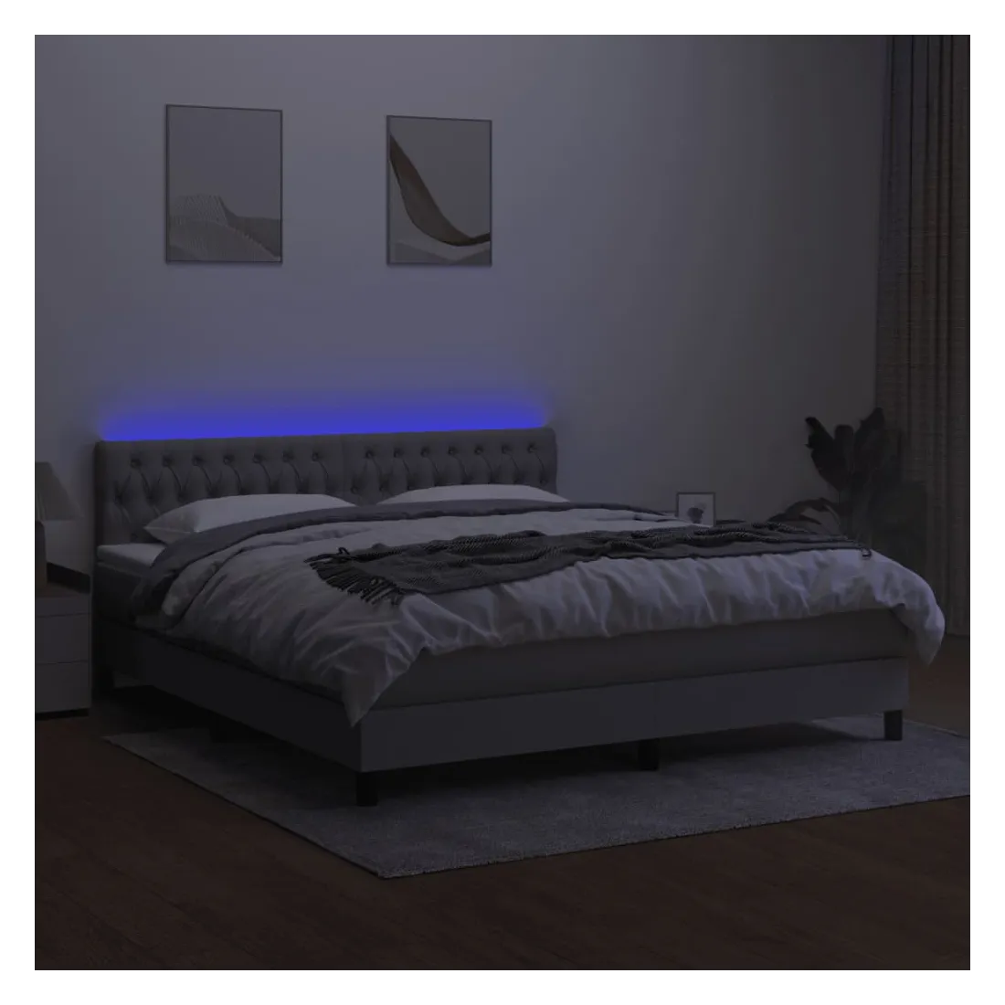 Utilisez ce sommier tapissier avec matelas et LED pour profiter d'un sommeil réparateur ! C'est le point central de votre chambre à coucher. Tissu durable : le tissu présente un aspect simple et épuré, et il est respirant et durable. Tête de lit pratique : la tête de lit est réglable en hauteur selon vos préférences. La tête de lit vous offre un excellent soutien du dos lorsque vous êtes assis dans votre lit pour lire ou regarder la télévision. Bande LED colorée : apportez de l'éclairage dans l'obscurité avec des lumières LED colorées ! Matelas à ressorts ensachés : le ressort ensaché individuel intégré est connu pour sa très haute qualité tout en assurant un haut niveau de durabilité et d'adaptabilité. Il peut absorber efficacement le bruit et les chocs causés par les sauts et les rot