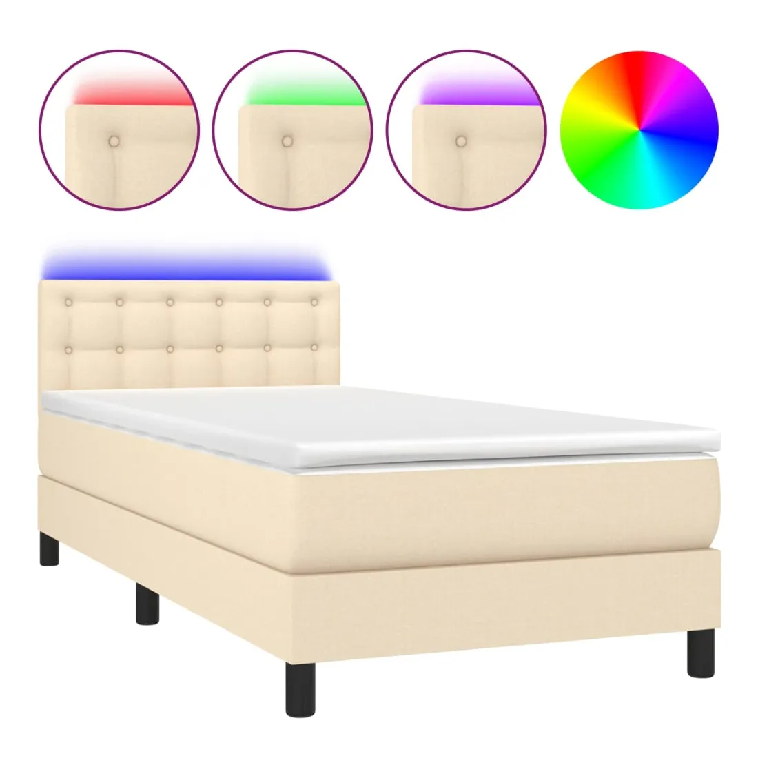 Utilisez ce sommier tapissier avec matelas et LED pour profiter d'un sommeil réparateur ! C'est le point central de votre chambre à coucher. Tissu durable : le tissu présente un aspect simple et épuré, et il est respirant et durable.Tête de lit pratique : la tête de lit est réglable en hauteur selon vos préférences. La tête de lit vous offre un excellent soutien du dos lorsque vous êtes assis dans votre lit pour lire ou regarder la télévision.Bande LED colorée : apportez de l'éclairage dans l'obscurité avec des lumières LED colorées !Matelas à ressorts ensachés : le ressort ensaché individuel intégré est connu pour sa très haute qualité tout en assurant un haut niveau de durabilité et d'adaptabilité. Il peut absorber efficacement le bruit et les chocs causés par les sauts et les rotations.Protège-matelas doux pour la peau : le protège-matelas est recouvert d'un tissu résistant et doux pour la peau, ce qui le rend souple et confortable. Remarque :Pour des raisons d'hygiène, le matelas ne peut pas être retourné si l'emballage est retiré ou ouvert.Chaque produit est livré avec un manuel de montage dans la boîte pour un montage facile.Seule la partie avec un symbole de ciseaux peut être coupée et seule la partie avec l'USB continuera à fonctionner comme avant.Ce produit est doté d'un connecteur USB, mais la source d'alimentation certifiée de USB 5V n'est pas incluse.