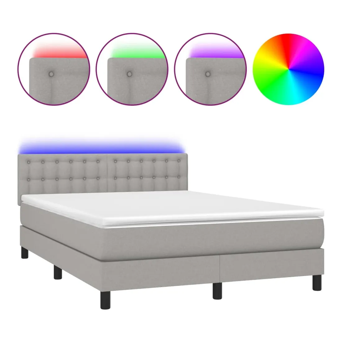 Utilisez ce sommier tapissier avec matelas et LED pour profiter d'un sommeil réparateur ! C'est le point central de votre chambre à coucher. Tissu durable : le tissu présente un aspect simple et épuré, et il est respirant et durable.Tête de lit pratique : la tête de lit est réglable en hauteur selon vos préférences. La tête de lit vous offre un excellent soutien du dos lorsque vous êtes assis dans votre lit pour lire ou regarder la télévision.Bande LED colorée : apportez de l'éclairage dans l'obscurité avec des lumières LED colorées !Matelas à ressorts ensachés : le ressort ensaché individuel intégré est connu pour sa très haute qualité tout en assurant un haut niveau de durabilité et d'adaptabilité. Il peut absorber efficacement le bruit et les chocs causés par les sauts et les rotations.Protège-matelas doux pour la peau : le protège-matelas est recouvert d'un tissu résistant et doux pour la peau, ce qui le rend souple et confortable. Remarque :Pour des raisons d'hygiène, le matelas ne peut pas être retourné si l'emballage est retiré ou ouvert.Chaque produit est livré avec un manuel de montage dans la boîte pour un montage facile.Seule la partie avec un symbole de ciseaux peut être coupée et seule la partie avec l'USB continuera à fonctionner comme avant.Ce produit est doté d'un connecteur USB, mais la source d'alimentation certifiée de USB 5V n'est pas incluse.