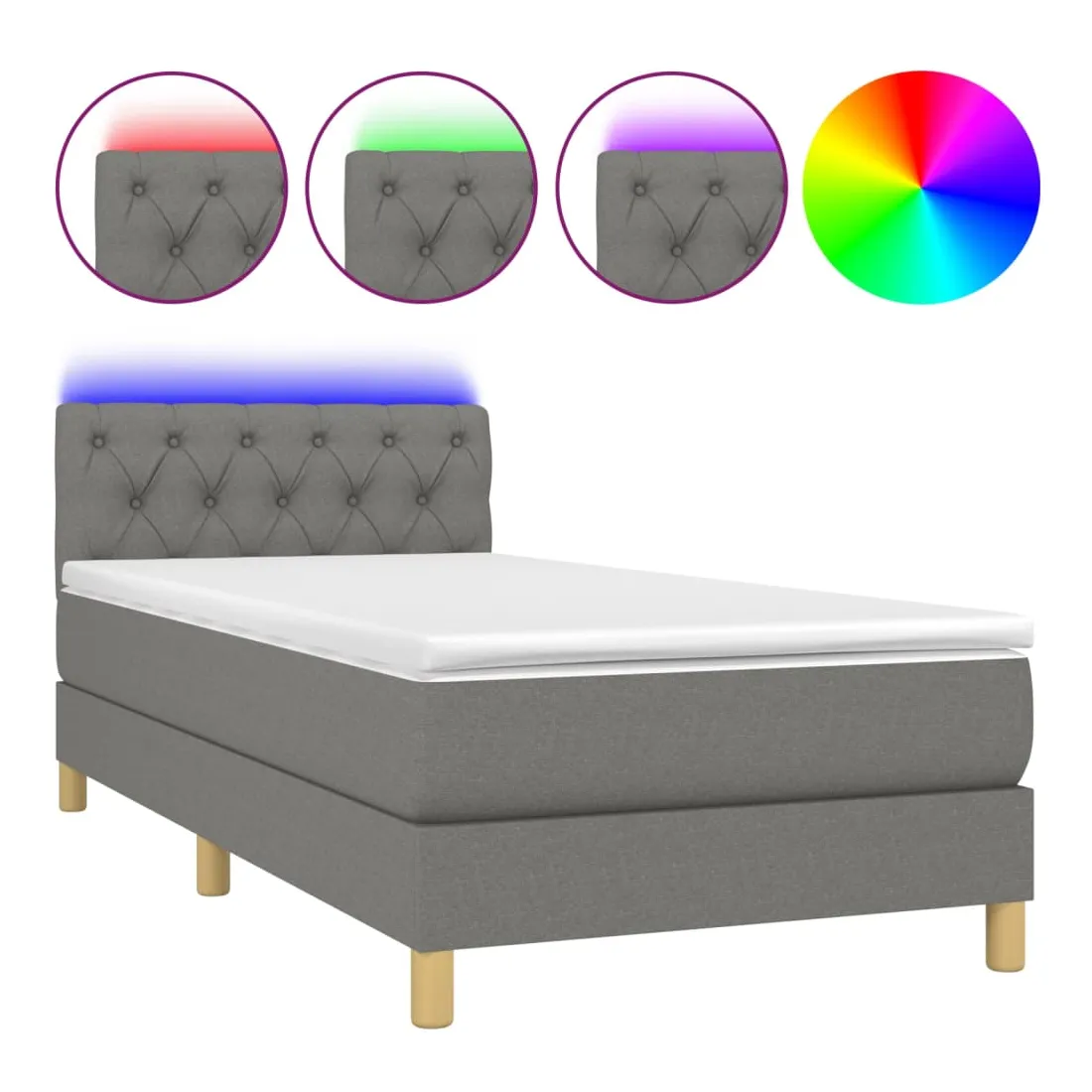 Utilisez ce sommier tapissier avec matelas et LED pour profiter d'un sommeil réparateur ! C'est le point central de votre chambre à coucher. Tissu durable : le tissu présente un aspect simple et épuré, et il est respirant et durable.Tête de lit pratique : la tête de lit est réglable en hauteur selon vos préférences. La tête de lit vous offre un excellent soutien du dos lorsque vous êtes assis dans votre lit pour lire ou regarder la télévision.Bande LED colorée : apportez de l'éclairage dans l'obscurité avec des lumières LED colorées !Matelas à ressorts ensachés : le ressort ensaché individuel intégré est connu pour sa très haute qualité tout en assurant un haut niveau de durabilité et d'adaptabilité. Il peut absorber efficacement le bruit et les chocs causés par les sauts et les rotations.Protège-matelas doux pour la peau : le protège-matelas est recouvert d'un tissu résistant et doux pour la peau, ce qui le rend souple et confortable. Remarque :Pour des raisons d'hygiène, le matelas ne peut pas être retourné si l'emballage est retiré ou ouvert.Chaque produit est livré avec un manuel de montage dans la boîte pour un montage facile.Seule la partie avec un symbole de ciseaux peut être coupée et seule la partie avec l'USB continuera à fonctionner comme avant.Ce produit est doté d'un connecteur USB, mais la source d'alimentation certifiée de USB 5V n'est pas incluse.