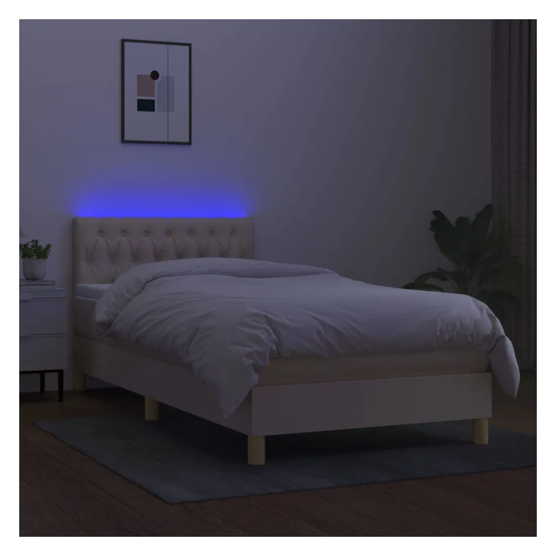 Utilisez ce sommier tapissier avec matelas et LED pour profiter d'un sommeil réparateur ! C'est le point central de votre chambre à coucher. Tissu durable : le tissu présente un aspect simple et épuré, et il est respirant et durable.Tête de lit pratique : la tête de lit est réglable en hauteur selon vos préférences. La tête de lit vous offre un excellent soutien du dos lorsque vous êtes assis dans votre lit pour lire ou regarder la télévision.Bande LED colorée : apportez de l'éclairage dans l'obscurité avec des lumières LED colorées !Matelas à ressorts ensachés : le ressort ensaché individuel intégré est connu pour sa très haute qualité tout en assurant un haut niveau de durabilité et d'adaptabilité. Il peut absorber efficacement le bruit et les chocs causés par les sauts et les rotations.Protège-matelas doux pour la peau : le protège-matelas est recouvert d'un tissu résistant et doux pour la peau, ce qui le rend souple et confortable. Remarque :Pour des raisons d'hygiène, le matelas ne peut pas être retourné si l'emballage est retiré ou ouvert.Chaque produit est livré avec un manuel de montage dans la boîte pour un montage facile.Seule la partie avec un symbole de ciseaux peut être coupée et seule la partie avec l'USB continuera à fonctionner comme avant.Ce produit est doté d'un connecteur USB, mais la source d'alimentation certifiée de USB 5V n'est pas incluse.