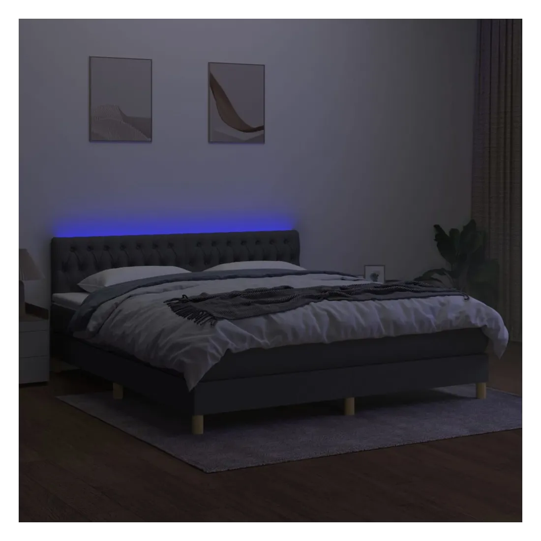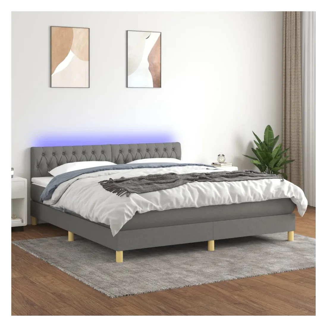 Utilisez ce sommier tapissier avec matelas et LED pour profiter d'un sommeil réparateur ! C'est le point central de votre chambre à coucher. Tissu durable : le tissu présente un aspect simple et épuré, et il est respirant et durable. Tête de lit pratique : la tête de lit est réglable en hauteur selon vos préférences. La tête de lit vous offre un excellent soutien du dos lorsque vous êtes assis dans votre lit pour lire ou regarder la télévision. Bande LED colorée : apportez de l'éclairage dans l'obscurité avec des lumières LED colorées ! Matelas à ressorts ensachés : le ressort ensaché individuel intégré est connu pour sa très haute qualité tout en assurant un haut niveau de durabilité et d'adaptabilité. Il peut absorber efficacement le bruit et les chocs causés par les sauts et les rot