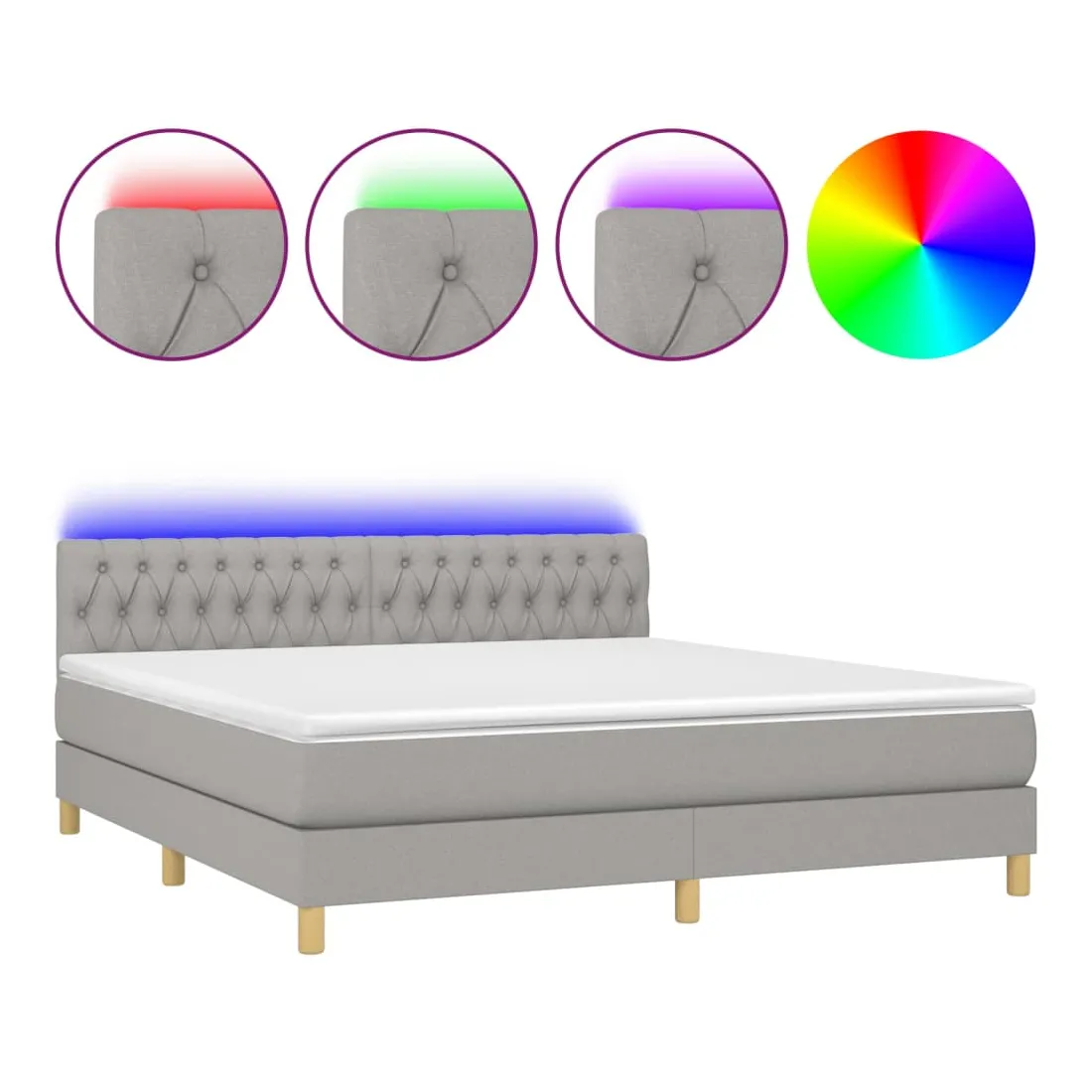 Utilisez ce sommier tapissier avec matelas et LED pour profiter d'un sommeil réparateur ! C'est le point central de votre chambre à coucher. Tissu durable : le tissu présente un aspect simple et épuré, et il est respirant et durable. Tête de lit pratique : la tête de lit est réglable en hauteur selon vos préférences. La tête de lit vous offre un excellent soutien du dos lorsque vous êtes assis dans votre lit pour lire ou regarder la télévision. Bande LED colorée : apportez de l'éclairage dans l'obscurité avec des lumières LED colorées ! Matelas à ressorts ensachés : le ressort ensaché individuel intégré est connu pour sa très haute qualité tout en assurant un haut niveau de durabilité et d'adaptabilité. Il peut absorber efficacement le bruit et les chocs causés par les sauts et les rot
