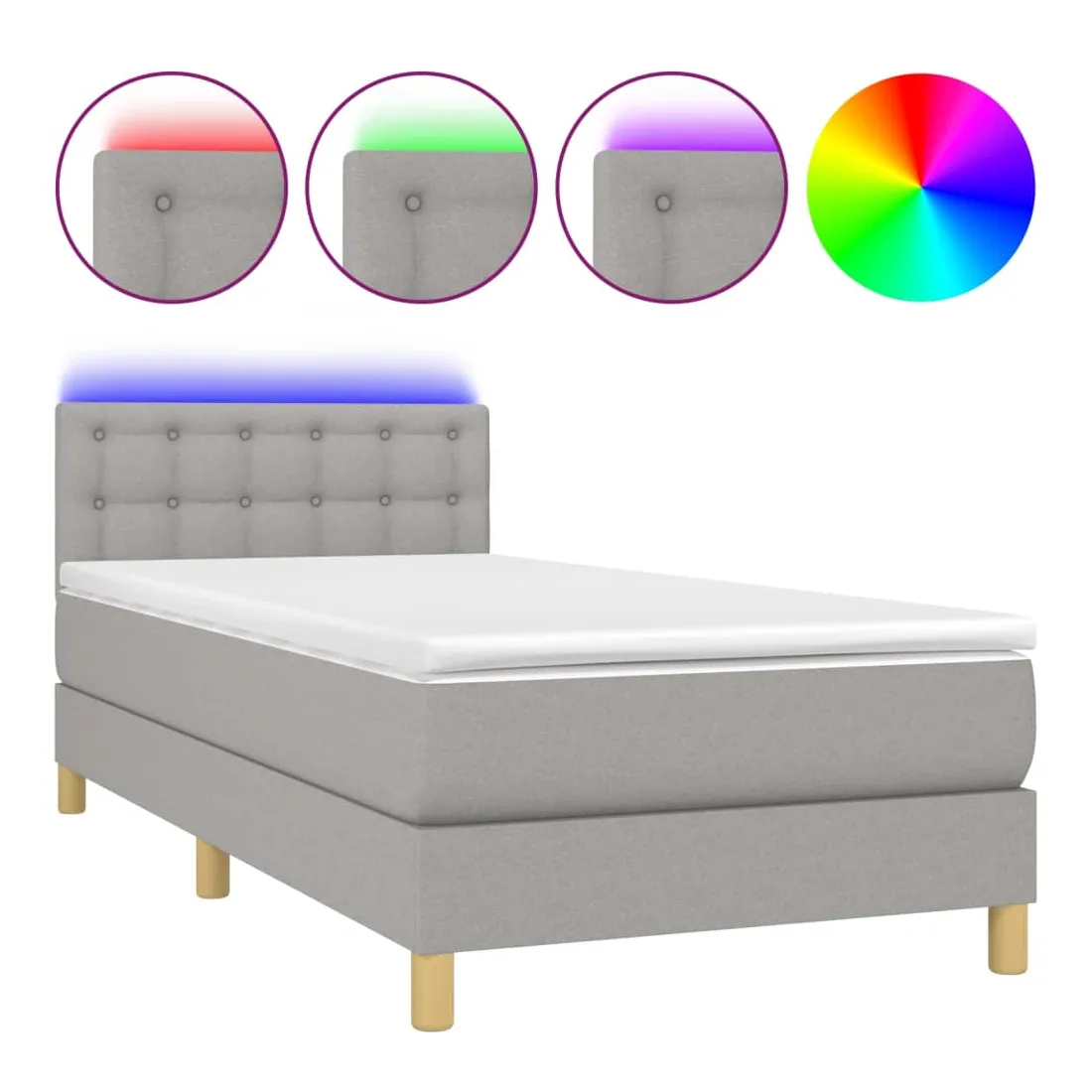 Utilisez ce sommier tapissier avec matelas et LED pour profiter d'un sommeil réparateur ! C'est le point central de votre chambre à coucher. Tissu durable : le tissu présente un aspect simple et épuré, et il est respirant et durable.Tête de lit pratique : la tête de lit est réglable en hauteur selon vos préférences. La tête de lit vous offre un excellent soutien du dos lorsque vous êtes assis dans votre lit pour lire ou regarder la télévision.Bande LED colorée : apportez de l'éclairage dans l'obscurité avec des lumières LED colorées !Matelas à ressorts ensachés : le ressort ensaché individuel intégré est connu pour sa très haute qualité tout en assurant un haut niveau de durabilité et d'adaptabilité. Il peut absorber efficacement le bruit et les chocs causés par les sauts et les rotations.Protège-matelas doux pour la peau : le protège-matelas est recouvert d'un tissu résistant et doux pour la peau, ce qui le rend souple et confortable. Remarque :Pour des raisons d'hygiène, le matelas ne peut pas être retourné si l'emballage est retiré ou ouvert.Chaque produit est livré avec un manuel de montage dans la boîte pour un montage facile.Seule la partie avec un symbole de ciseaux peut être coupée et seule la partie avec l'USB continuera à fonctionner comme avant.Ce produit est doté d'un connecteur USB, mais la source d'alimentation certifiée de USB 5V n'est pas incluse.