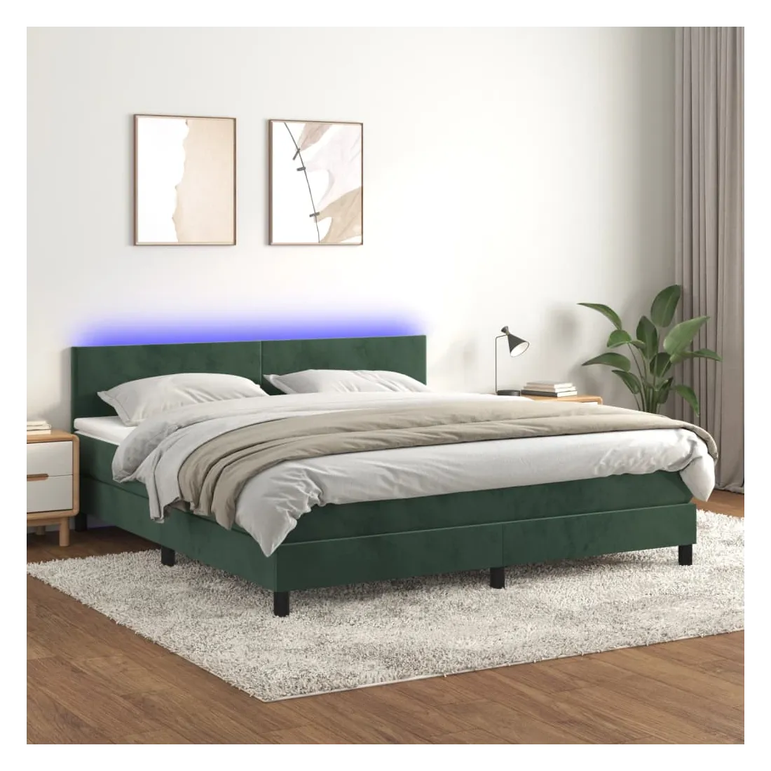 Utilisez ce sommier tapissier avec matelas et LED pour profiter d'un sommeil réparateur ! C'est le point central de votre chambre à coucher. Velours doux : le velours est un tissu doux et luxueux qui se reconnaît à son tas dense de fibres uniformément coupées qui ont une touche lisse. Le tissu en velours présente un toucher doux distinctif, ce qui le rend confortable au toucher.Tête de lit pratique : la tête de lit est réglable en hauteur selon vos préférences. La tête de lit vous offre un excellent soutien du dos lorsque vous êtes assis dans votre lit pour lire ou regarder la télévision.Bande LED colorée : apportez de l'éclairage dans l'obscurité avec des lumières LED colorées !Matelas à ressorts ensachés : le ressort ensaché individuel intégré est connu pour sa très haute qualité tout en assurant un haut niveau de durabilité et d'adaptabilité. Il peut absorber efficacement le bruit et les chocs causés par les sauts et les rotations.Protège-matelas doux pour la peau : le protège-matelas est recouvert d'un tissu résistant et doux pour la peau, ce qui le rend souple et confortable. Remarque :Pour des raisons d'hygiène, le matelas ne peut pas être retourné si l'emballage est retiré ou ouvert.Chaque produit est livré avec un manuel de montage dans la boîte pour un montage facile.Seule la partie avec un symbole de ciseaux peut être coupée et seule la partie avec l'USB continuera à fonctionner comme avant.Ce produit est doté d'un connecteur USB, mais la source d'alimentation certifiée de USB 5V n'est pas incluse.