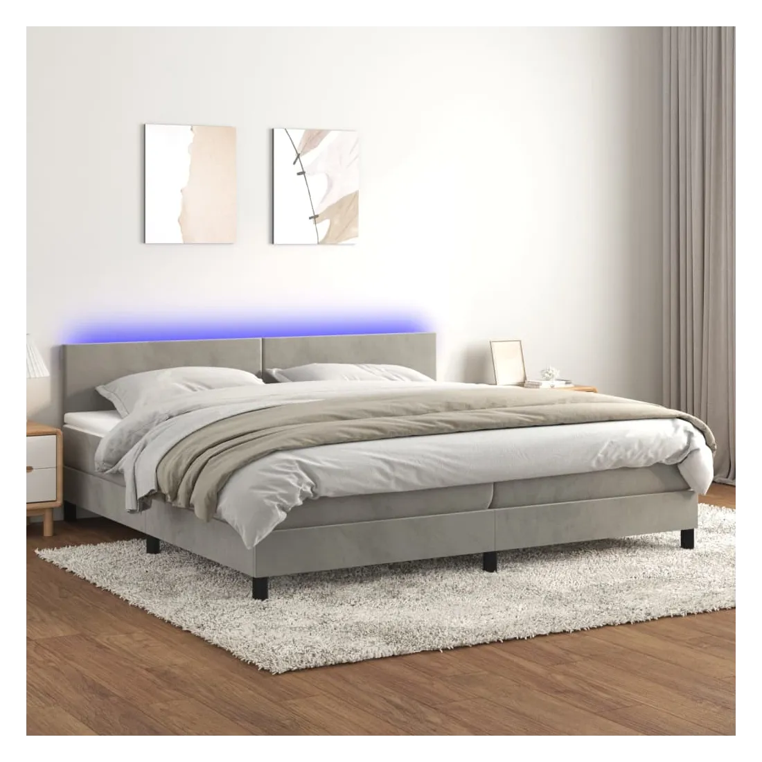 Utilisez ce sommier tapissier avec matelas et LED pour profiter d'un sommeil réparateur ! C'est le point central de votre chambre à coucher. Velours doux : le velours est un tissu doux et luxueux qui se reconnaît à son tas dense de fibres uniformément coupées qui ont une touche lisse. Le tissu en velours présente un toucher doux distinctif, ce qui le rend confortable au toucher.Tête de lit pratique : la tête de lit est réglable en hauteur selon vos préférences. La tête de lit vous offre un excellent soutien du dos lorsque vous êtes assis dans votre lit pour lire ou regarder la télévision.Bande LED colorée : apportez de l'éclairage dans l'obscurité avec des lumières LED colorées !Matelas à ressorts ensachés : le ressort ensaché individuel intégré est connu pour sa très haute qualité tout en assurant un haut niveau de durabilité et d'adaptabilité. Il peut absorber efficacement le bruit et les chocs causés par les sauts et les rotations.Protège-matelas doux pour la peau : le protège-matelas est recouvert d'un tissu résistant et doux pour la peau, ce qui le rend souple et confortable. Remarque :Pour des raisons d'hygiène, le matelas ne peut pas être retourné si l'emballage est retiré ou ouvert.Chaque produit est livré avec un manuel de montage dans la boîte pour un montage facile.Seule la partie avec un symbole de ciseaux peut être coupée et seule la partie avec l'USB continuera à fonctionner comme avant.Ce produit est doté d'un connecteur USB, mais la source d'alimentation certifiée de USB 5V n'est pas incluse.