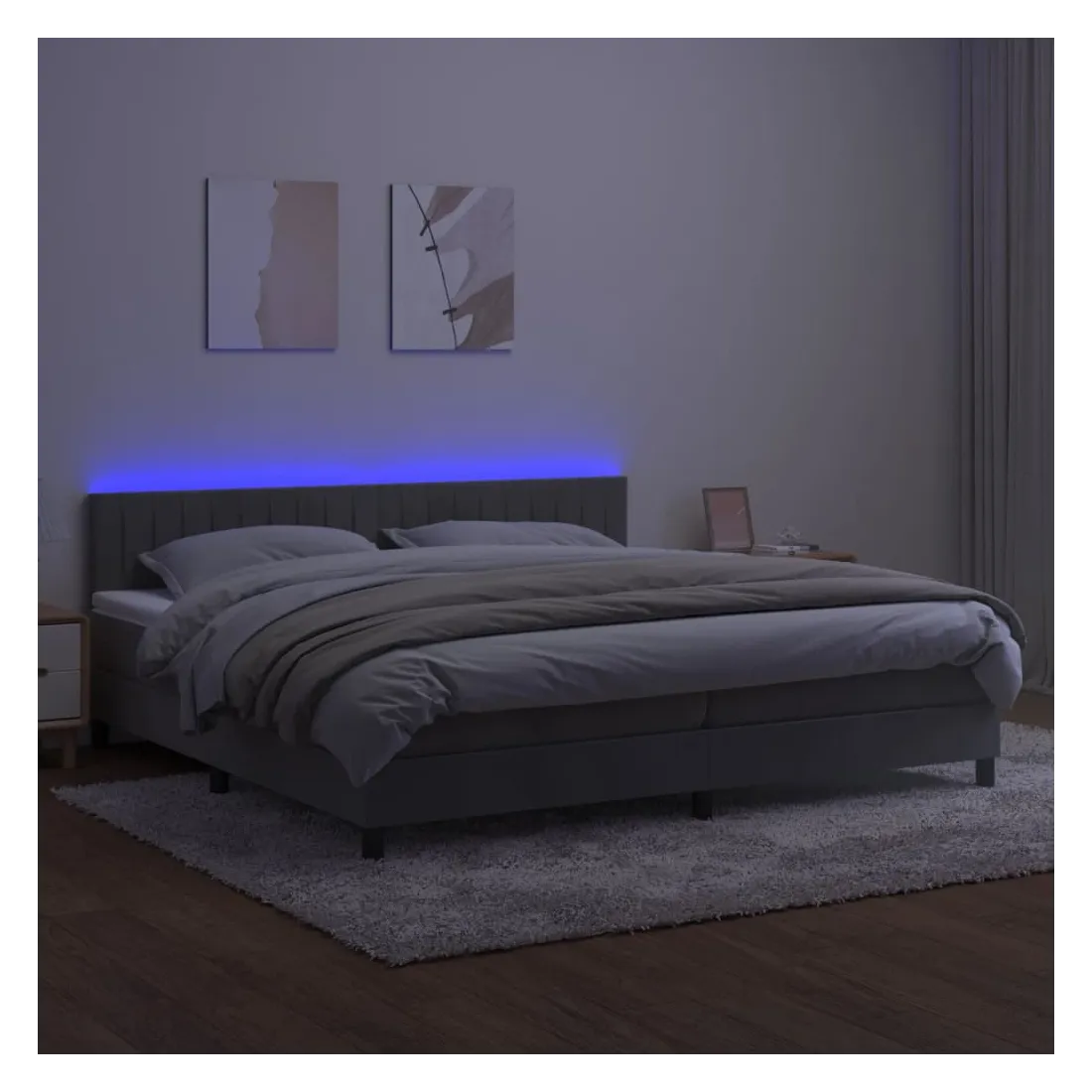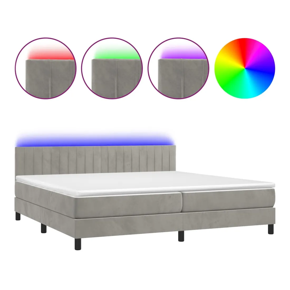 Utilisez ce sommier tapissier avec matelas et LED pour profiter d'un sommeil réparateur ! C'est le point central de votre chambre à coucher. Velours doux : le velours est un tissu doux et luxueux qui se reconnaît à son tas dense de fibres uniformément coupées qui ont une touche lisse. Le tissu en velours présente un toucher doux distinctif, ce qui le rend confortable au toucher.Tête de lit pratique : la tête de lit est réglable en hauteur selon vos préférences. La tête de lit vous offre un excellent soutien du dos lorsque vous êtes assis dans votre lit pour lire ou regarder la télévision.Bande LED colorée : apportez de l'éclairage dans l'obscurité avec des lumières LED colorées !Matelas à ressorts ensachés : le ressort ensaché individuel intégré est connu pour sa très haute qualité tout en assurant un haut niveau de durabilité et d'adaptabilité. Il peut absorber efficacement le bruit et les chocs causés par les sauts et les rotations.Protège-matelas doux pour la peau : le protège-matelas est recouvert d'un tissu résistant et doux pour la peau, ce qui le rend souple et confortable. Remarque :Pour des raisons d'hygiène, le matelas ne peut pas être retourné si l'emballage est retiré ou ouvert.Chaque produit est livré avec un manuel de montage dans la boîte pour un montage facile.Seule la partie avec un symbole de ciseaux peut être coupée et seule la partie avec l'USB continuera à fonctionner comme avant.Ce produit est doté d'un connecteur USB, mais la source d'alimentation certifiée de USB 5V n'est pas incluse.