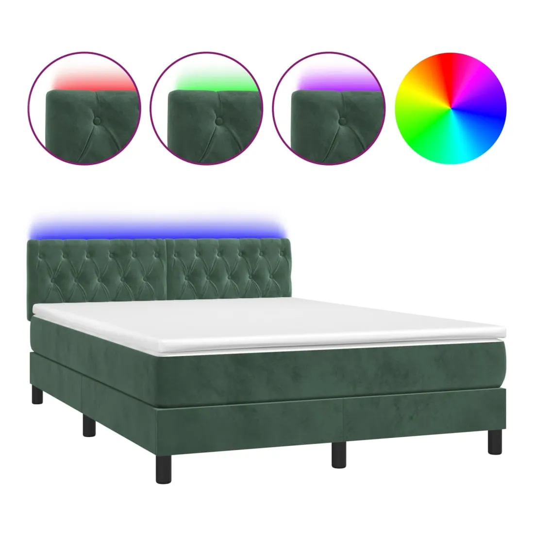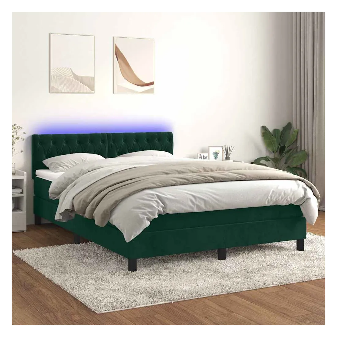 Utilisez ce sommier tapissier avec matelas et LED pour profiter d'un sommeil réparateur ! C'est le point central de votre chambre à coucher. Velours doux : le velours est un tissu doux et luxueux qui se reconnaît à son tas dense de fibres uniformément coupées qui ont une touche lisse. Le tissu en velours présente un toucher doux distinctif, ce qui le rend confortable au toucher.Tête de lit pratique : la tête de lit est réglable en hauteur selon vos préférences. La tête de lit vous offre un excellent soutien du dos lorsque vous êtes assis dans votre lit pour lire ou regarder la télévision.Bande LED colorée : apportez de l'éclairage dans l'obscurité avec des lumières LED colorées !Matelas à ressorts ensachés : le ressort ensaché individuel intégré est connu pour sa très haute qualité tout en assurant un haut niveau de durabilité et d'adaptabilité. Il peut absorber efficacement le bruit et les chocs causés par les sauts et les rotations.Protège-matelas doux pour la peau : le protège-matelas est recouvert d'un tissu résistant et doux pour la peau, ce qui le rend souple et confortable. Remarque :Pour des raisons d'hygiène, le matelas ne peut pas être retourné si l'emballage est retiré ou ouvert.Chaque produit est livré avec un manuel de montage dans la boîte pour un montage facile.Seule la partie avec un symbole de ciseaux peut être coupée et seule la partie avec l'USB continuera à fonctionner comme avant.Ce produit est doté d'un connecteur USB, mais la source d'alimentation certifiée de USB 5V n'est pas incluse.