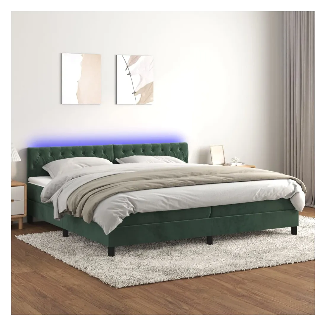 Utilisez ce sommier tapissier avec matelas et LED pour profiter d'un sommeil réparateur ! C'est le point central de votre chambre à coucher. Velours doux : le velours est un tissu doux et luxueux qui se reconnaît à son tas dense de fibres uniformément coupées qui ont une touche lisse. Le tissu en velours présente un toucher doux distinctif, ce qui le rend confortable au toucher.Tête de lit pratique : la tête de lit est réglable en hauteur selon vos préférences. La tête de lit vous offre un excellent soutien du dos lorsque vous êtes assis dans votre lit pour lire ou regarder la télévision.Bande LED colorée : apportez de l'éclairage dans l'obscurité avec des lumières LED colorées !Matelas à ressorts ensachés : le ressort ensaché individuel intégré est connu pour sa très haute qualité tout en assurant un haut niveau de durabilité et d'adaptabilité. Il peut absorber efficacement le bruit et les chocs causés par les sauts et les rotations.Protège-matelas doux pour la peau : le protège-matelas est recouvert d'un tissu résistant et doux pour la peau, ce qui le rend souple et confortable. Remarque :Pour des raisons d'hygiène, le matelas ne peut pas être retourné si l'emballage est retiré ou ouvert.Chaque produit est livré avec un manuel de montage dans la boîte pour un montage facile.Seule la partie avec un symbole de ciseaux peut être coupée et seule la partie avec l'USB continuera à fonctionner comme avant.Ce produit est doté d'un connecteur USB, mais la source d'alimentation certifiée de USB 5V n'est pas incluse.