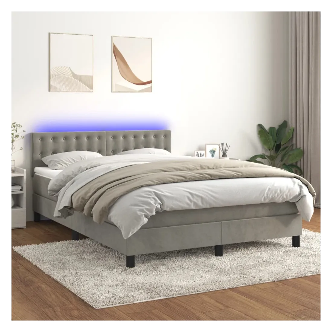 Utilisez ce sommier tapissier avec matelas et LED pour profiter d'un sommeil réparateur ! C'est le point central de votre chambre à coucher. Velours doux : le velours est un tissu doux et luxueux qui se reconnaît à son tas dense de fibres uniformément coupées qui ont une touche lisse. Le tissu en velours présente un toucher doux distinctif, ce qui le rend confortable au toucher.Tête de lit pratique : la tête de lit est réglable en hauteur selon vos préférences. La tête de lit vous offre un excellent soutien du dos lorsque vous êtes assis dans votre lit pour lire ou regarder la télévision.Bande LED colorée : apportez de l'éclairage dans l'obscurité avec des lumières LED colorées !Matelas à ressorts ensachés : le ressort ensaché individuel intégré est connu pour sa très haute qualité tout en assurant un haut niveau de durabilité et d'adaptabilité. Il peut absorber efficacement le bruit et les chocs causés par les sauts et les rotations.Protège-matelas doux pour la peau : le protège-matelas est recouvert d'un tissu résistant et doux pour la peau, ce qui le rend souple et confortable. Remarque :Pour des raisons d'hygiène, le matelas ne peut pas être retourné si l'emballage est retiré ou ouvert.Chaque produit est livré avec un manuel de montage dans la boîte pour un montage facile.Seule la partie avec un symbole de ciseaux peut être coupée et seule la partie avec l'USB continuera à fonctionner comme avant.Ce produit est doté d'un connecteur USB, mais la source d'alimentation certifiée de USB 5V n'est pas incluse.