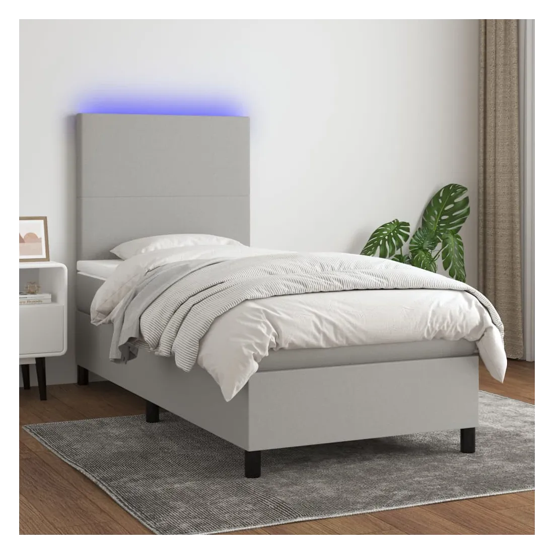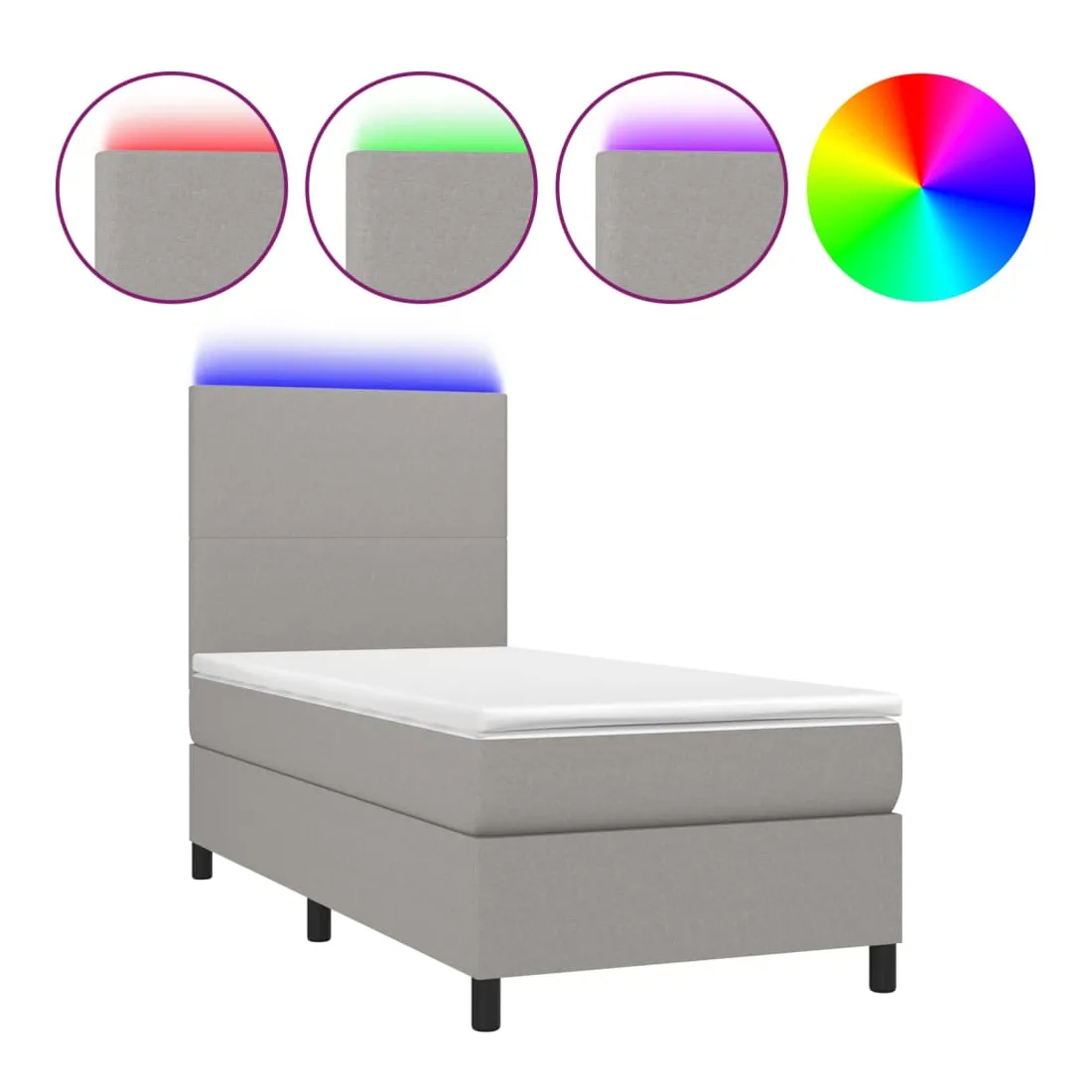 Utilisez ce sommier tapissier avec matelas et LED pour profiter d'un sommeil réparateur ! C'est le point central de votre chambre à coucher. Tissu durable : le tissu présente un aspect simple et épuré, et il est respirant et durable.Tête de lit pratique : la tête de lit est réglable en hauteur selon vos préférences. La tête de lit vous offre un excellent soutien du dos lorsque vous êtes assis dans votre lit pour lire ou regarder la télévision.Bande LED colorée : apportez de l'éclairage dans l'obscurité avec des lumières LED colorées !Matelas à ressorts ensachés : le ressort ensaché individuel intégré est connu pour sa très haute qualité tout en assurant un haut niveau de durabilité et d'adaptabilité. Il peut absorber efficacement le bruit et les chocs causés par les sauts et les rotations.Protège-matelas doux pour la peau : le protège-matelas est recouvert d'un tissu résistant et doux pour la peau, ce qui le rend souple et confortable. Remarque :Pour des raisons d'hygiène, le matelas ne peut pas être retourné si l'emballage est retiré ou ouvert.Seule la partie avec un symbole de ciseaux peut être coupée et seule la partie avec l'USB continuera à fonctionner comme avant.Chaque produit est livré avec un manuel de montage dans la boîte pour un montage facile.Ce produit est doté d'un connecteur USB, mais la source d'alimentation certifiée de USB 5V n'est pas incluse.