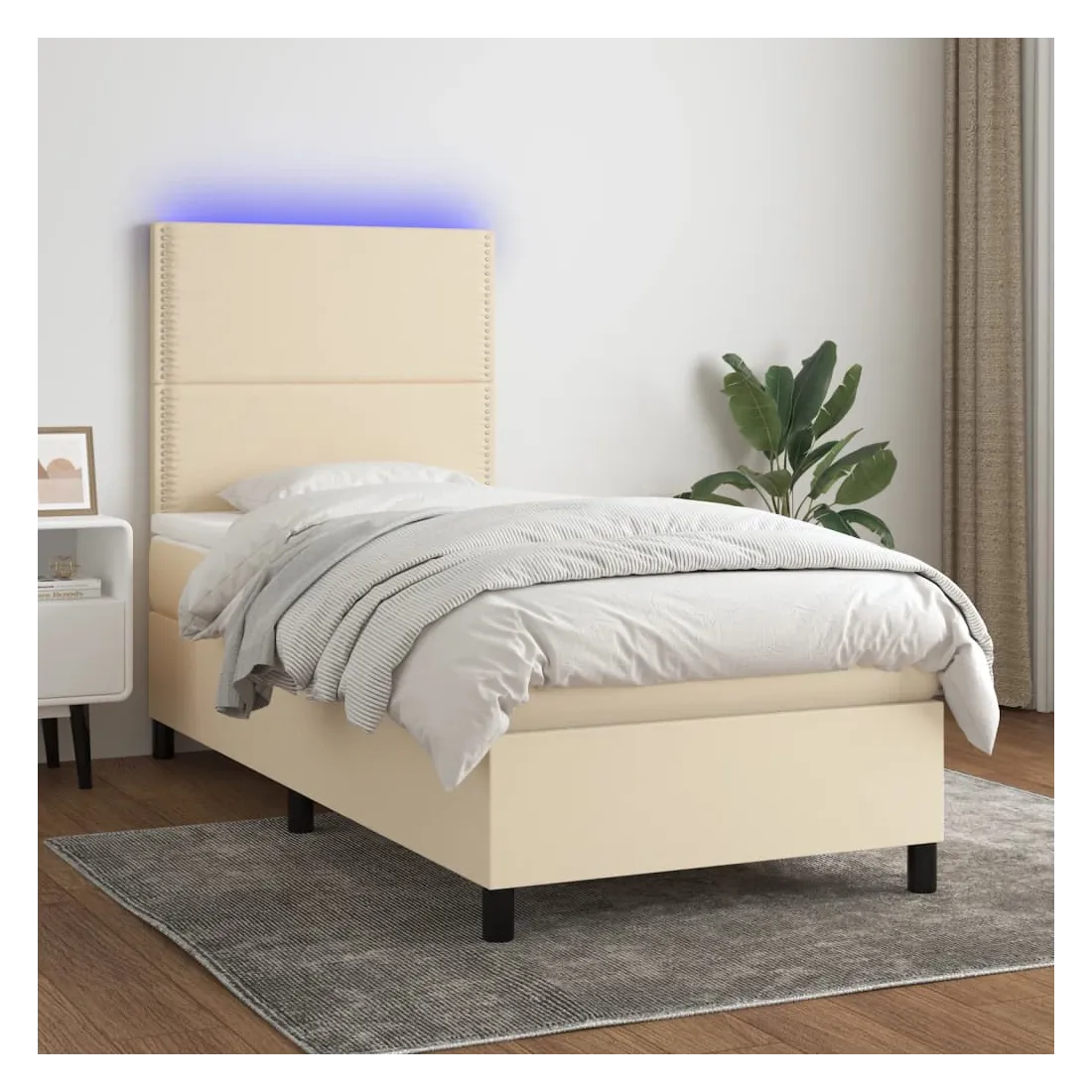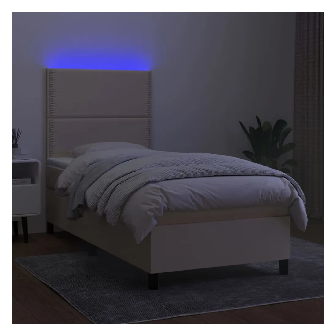 Utilisez ce sommier tapissier avec matelas et LED pour profiter d'un sommeil réparateur ! C'est le point central de votre chambre à coucher. Tissu durable : le tissu présente un aspect simple et épuré, et il est respirant et durable.Tête de lit pratique : la tête de lit est réglable en hauteur selon vos préférences. La tête de lit vous offre un excellent soutien du dos lorsque vous êtes assis dans votre lit pour lire ou regarder la télévision.Bande LED colorée : apportez de l'éclairage dans l'obscurité avec des lumières LED colorées !Matelas à ressorts ensachés : le ressort ensaché individuel intégré est connu pour sa très haute qualité tout en assurant un haut niveau de durabilité et d'adaptabilité. Il peut absorber efficacement le bruit et les chocs causés par les sauts et les rotations.Protège-matelas doux pour la peau : le protège-matelas est recouvert d'un tissu résistant et doux pour la peau, ce qui le rend souple et confortable. Remarque :Pour des raisons d'hygiène, le matelas ne peut pas être retourné si l'emballage est retiré ou ouvert.Seule la partie avec un symbole de ciseaux peut être coupée et seule la partie avec l'USB continuera à fonctionner comme avant.Chaque produit est livré avec un manuel de montage dans la boîte pour un montage facile.Ce produit est doté d'un connecteur USB, mais la source d'alimentation certifiée de USB 5V n'est pas incluse.