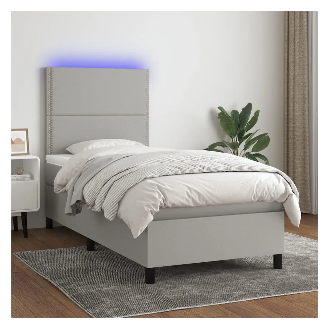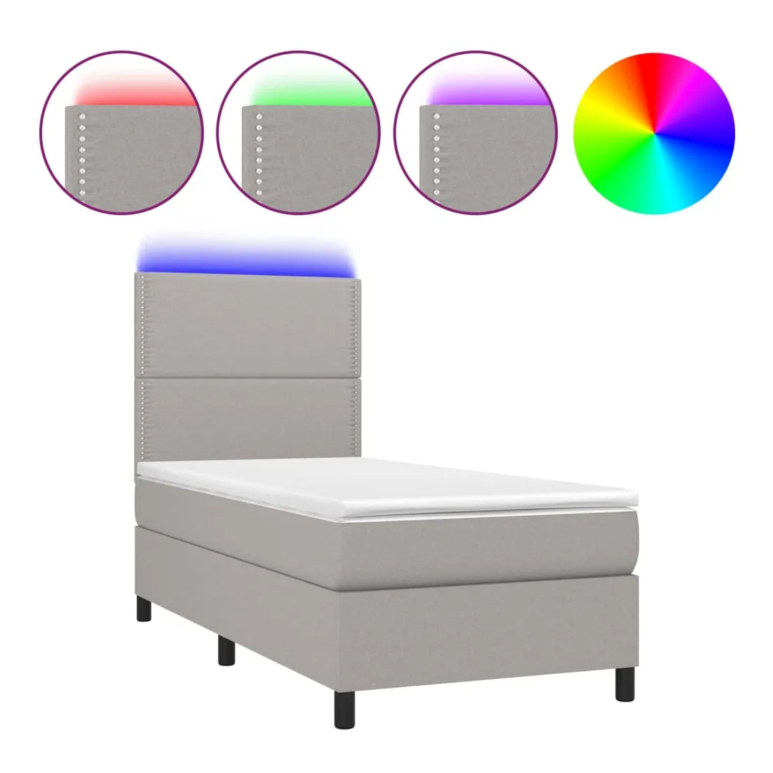 Utilisez ce sommier tapissier avec matelas et LED pour profiter d'un sommeil réparateur ! C'est le point central de votre chambre à coucher. Tissu durable : le tissu présente un aspect simple et épuré, et il est respirant et durable.Tête de lit pratique : la tête de lit est réglable en hauteur selon vos préférences. La tête de lit vous offre un excellent soutien du dos lorsque vous êtes assis dans votre lit pour lire ou regarder la télévision.Bande LED colorée : apportez de l'éclairage dans l'obscurité avec des lumières LED colorées !Matelas à ressorts ensachés : le ressort ensaché individuel intégré est connu pour sa très haute qualité tout en assurant un haut niveau de durabilité et d'adaptabilité. Il peut absorber efficacement le bruit et les chocs causés par les sauts et les rotations.Protège-matelas doux pour la peau : le protège-matelas est recouvert d'un tissu résistant et doux pour la peau, ce qui le rend souple et confortable. Remarque :Pour des raisons d'hygiène, le matelas ne peut pas être retourné si l'emballage est retiré ou ouvert.Seule la partie avec un symbole de ciseaux peut être coupée et seule la partie avec l'USB continuera à fonctionner comme avant.Chaque produit est livré avec un manuel de montage dans la boîte pour un montage facile.Ce produit est doté d'un connecteur USB, mais la source d'alimentation certifiée de USB 5V n'est pas incluse.