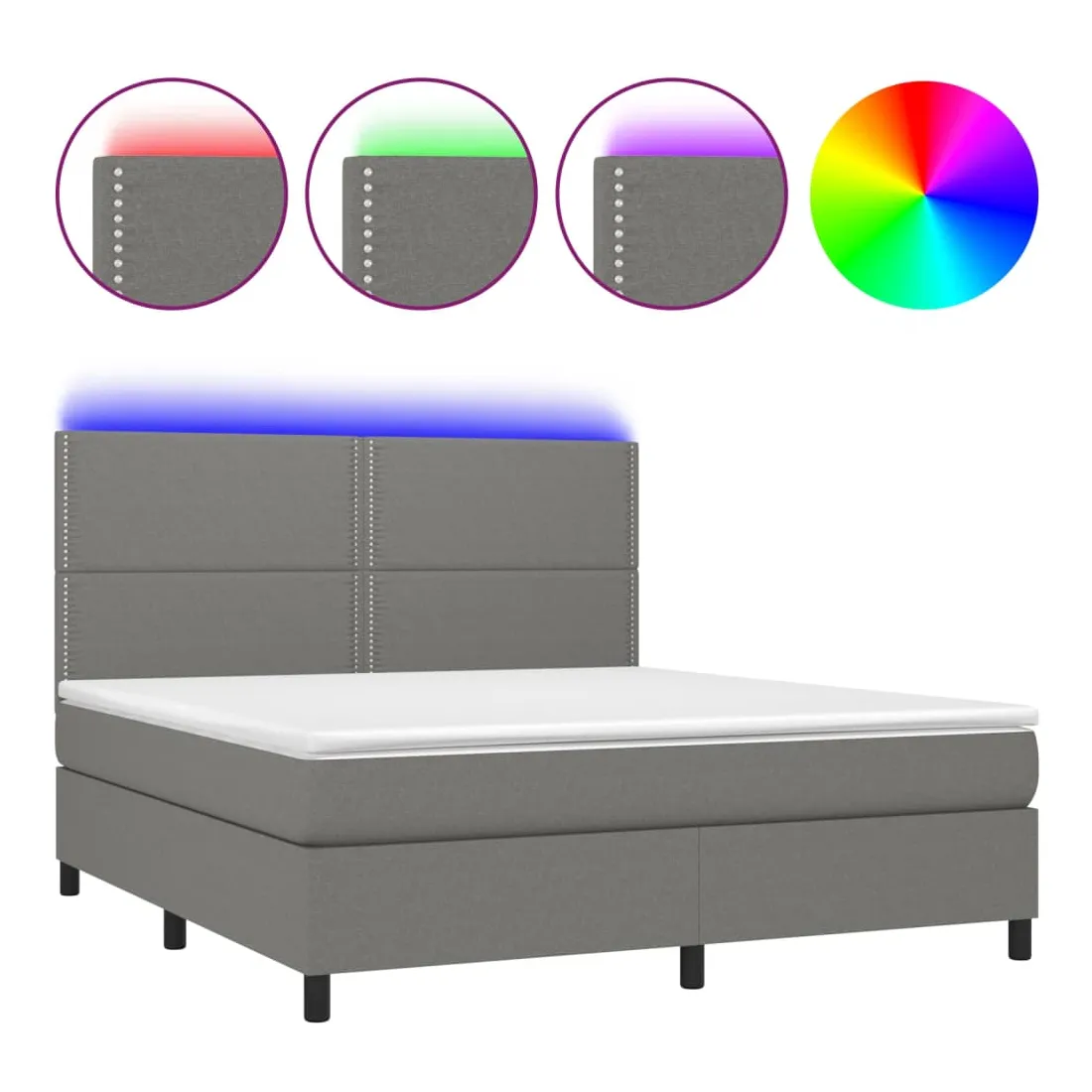 Utilisez ce sommier tapissier avec matelas et LED pour profiter d'un sommeil réparateur ! C'est le point central de votre chambre à coucher. Tissu durable : le tissu présente un aspect simple et épuré, et il est respirant et durable.Tête de lit pratique : la tête de lit est réglable en hauteur selon vos préférences. La tête de lit vous offre un excellent soutien du dos lorsque vous êtes assis dans votre lit pour lire ou regarder la télévision.Bande LED colorée : apportez de l'éclairage dans l'obscurité avec des lumières LED colorées !Matelas à ressorts ensachés : le ressort ensaché individuel intégré est connu pour sa très haute qualité tout en assurant un haut niveau de durabilité et d'adaptabilité. Il peut absorber efficacement le bruit et les chocs causés par les sauts et les rotations.Protège-matelas doux pour la peau : le protège-matelas est recouvert d'un tissu résistant et doux pour la peau, ce qui le rend souple et confortable. Remarque :Pour des raisons d'hygiène, le matelas ne peut pas être retourné si l'emballage est retiré ou ouvert.Seule la partie avec un symbole de ciseaux peut être coupée et seule la partie avec l'USB continuera à fonctionner comme avant.Chaque produit est livré avec un manuel de montage dans la boîte pour un montage facile.Ce produit est doté d'un connecteur USB, mais la source d'alimentation certifiée de USB 5V n'est pas incluse.