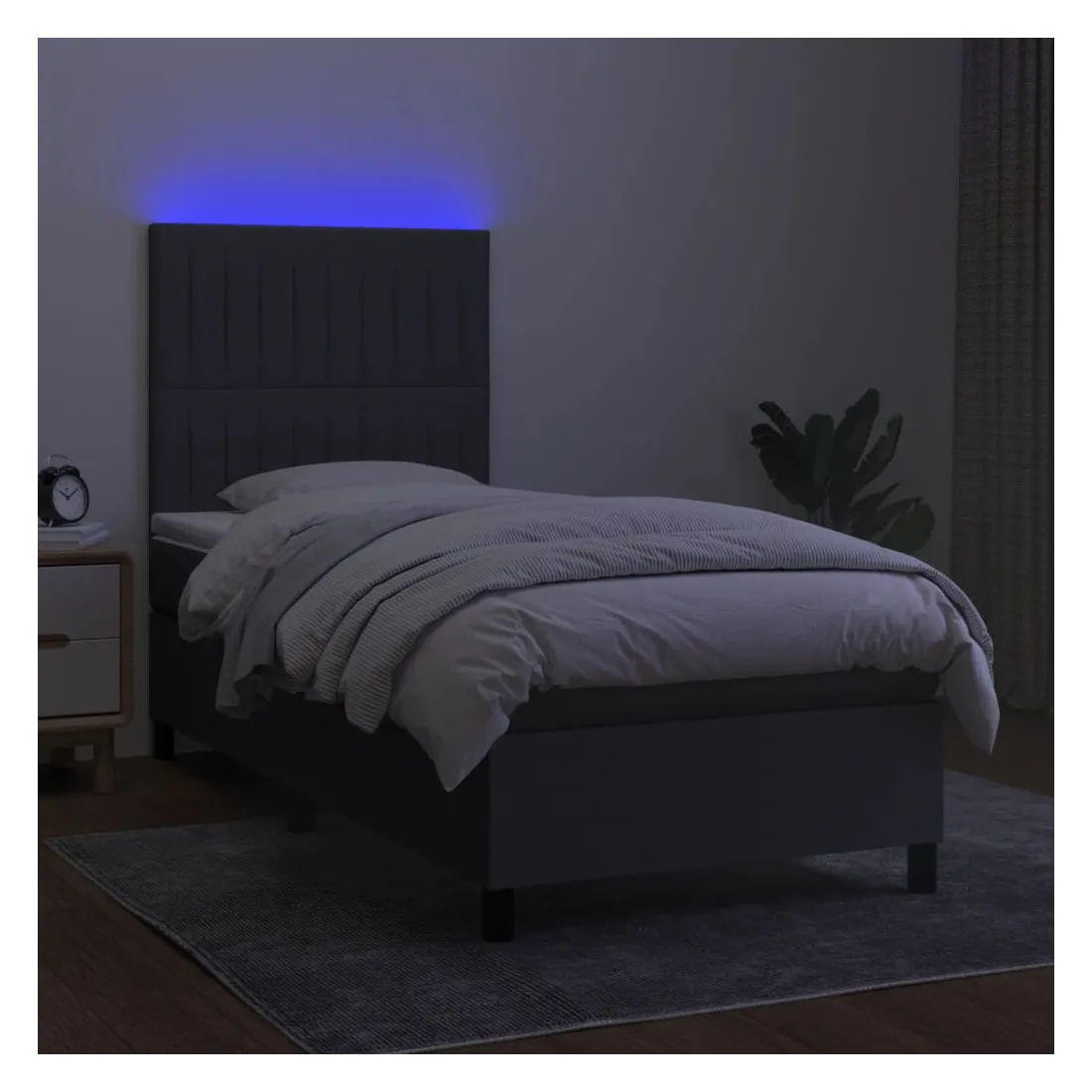 Utilisez ce sommier tapissier avec matelas et LED pour profiter d'un sommeil réparateur ! C'est le point central de votre chambre à coucher. Tissu durable : le tissu présente un aspect simple et épuré, et il est respirant et durable.Tête de lit pratique : la tête de lit est réglable en hauteur selon vos préférences. La tête de lit vous offre un excellent soutien du dos lorsque vous êtes assis dans votre lit pour lire ou regarder la télévision.Bande LED colorée : apportez de l'éclairage dans l'obscurité avec des lumières LED colorées !Matelas à ressorts ensachés : le ressort ensaché individuel intégré est connu pour sa très haute qualité tout en assurant un haut niveau de durabilité et d'adaptabilité. Il peut absorber efficacement le bruit et les chocs causés par les sauts et les rotations.Protège-matelas doux pour la peau : le protège-matelas est recouvert d'un tissu résistant et doux pour la peau, ce qui le rend souple et confortable. Remarque :Pour des raisons d'hygiène, le matelas ne peut pas être retourné si l'emballage est retiré ou ouvert.Seule la partie avec un symbole de ciseaux peut être coupée et seule la partie avec l'USB continuera à fonctionner comme avant.Chaque produit est livré avec un manuel de montage dans la boîte pour un montage facile.Ce produit est doté d'un connecteur USB, mais la source d'alimentation certifiée de USB 5V n'est pas incluse.