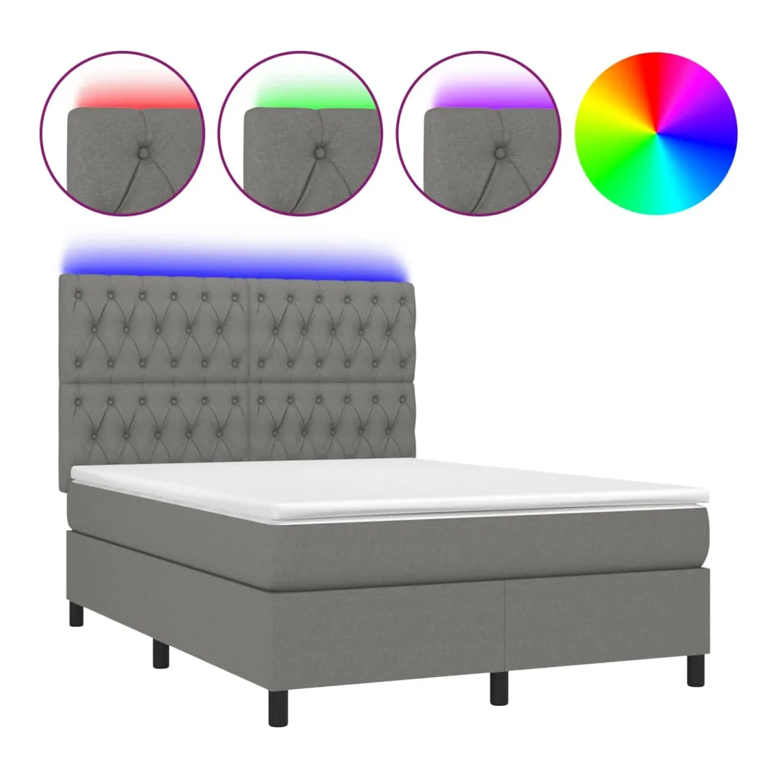 Utilisez ce sommier tapissier avec matelas et LED pour profiter d'un sommeil réparateur ! C'est le point central de votre chambre à coucher. Tissu durable : le tissu présente un aspect simple et épuré, et il est respirant et durable.Tête de lit pratique : la tête de lit est réglable en hauteur selon vos préférences. La tête de lit vous offre un excellent soutien du dos lorsque vous êtes assis dans votre lit pour lire ou regarder la télévision.Bande LED colorée : apportez de l'éclairage dans l'obscurité avec des lumières LED colorées !Matelas à ressorts ensachés : le ressort ensaché individuel intégré est connu pour sa très haute qualité tout en assurant un haut niveau de durabilité et d'adaptabilité. Il peut absorber efficacement le bruit et les chocs causés par les sauts et les rotations.Protège-matelas doux pour la peau : le protège-matelas est recouvert d'un tissu résistant et doux pour la peau, ce qui le rend souple et confortable. Remarque :Pour des raisons d'hygiène, le matelas ne peut pas être retourné si l'emballage est retiré ou ouvert.Seule la partie avec un symbole de ciseaux peut être coupée et seule la partie avec l'USB continuera à fonctionner comme avant.Chaque produit est livré avec un manuel de montage dans la boîte pour un montage facile.Ce produit est doté d'un connecteur USB, mais la source d'alimentation certifiée de USB 5V n'est pas incluse.