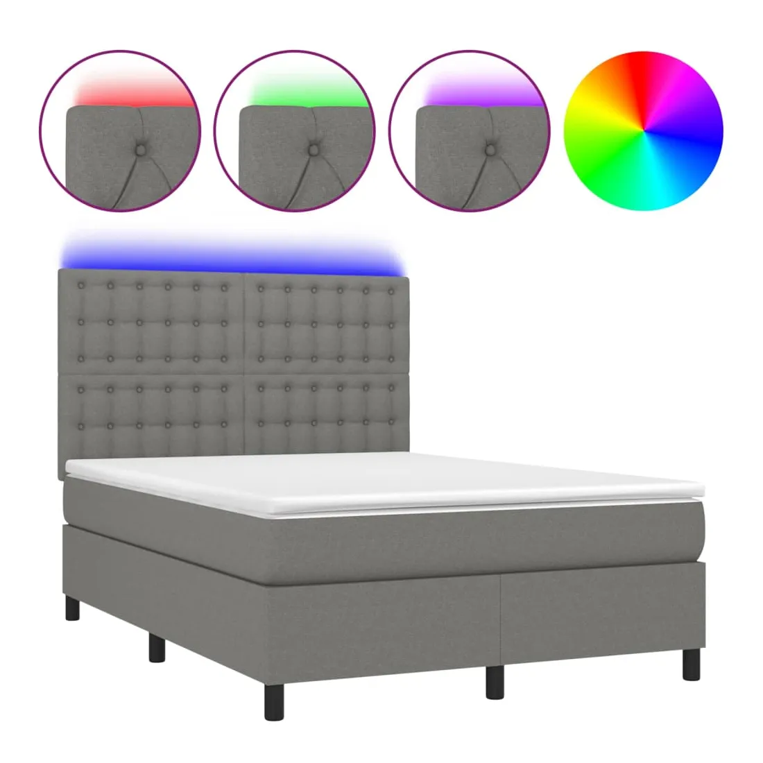 Utilisez ce sommier tapissier avec matelas et LED pour profiter d'un sommeil réparateur ! C'est le point central de votre chambre à coucher. Tissu durable : le tissu présente un aspect simple et épuré, et il est respirant et durable.Tête de lit pratique : la tête de lit est réglable en hauteur selon vos préférences. La tête de lit vous offre un excellent soutien du dos lorsque vous êtes assis dans votre lit pour lire ou regarder la télévision.Bande LED colorée : apportez de l'éclairage dans l'obscurité avec des lumières LED colorées !Matelas à ressorts ensachés : le ressort ensaché individuel intégré est connu pour sa très haute qualité tout en assurant un haut niveau de durabilité et d'adaptabilité. Il peut absorber efficacement le bruit et les chocs causés par les sauts et les rotations.Protège-matelas doux pour la peau : le protège-matelas est recouvert d'un tissu résistant et doux pour la peau, ce qui le rend souple et confortable. Remarque :Pour des raisons d'hygiène, le matelas ne peut pas être retourné si l'emballage est retiré ou ouvert.Seule la partie avec un symbole de ciseaux peut être coupée et seule la partie avec l'USB continuera à fonctionner comme avant.Chaque produit est livré avec un manuel de montage dans la boîte pour un montage facile.Ce produit est doté d'un connecteur USB, mais la source d'alimentation certifiée de USB 5V n'est pas incluse.